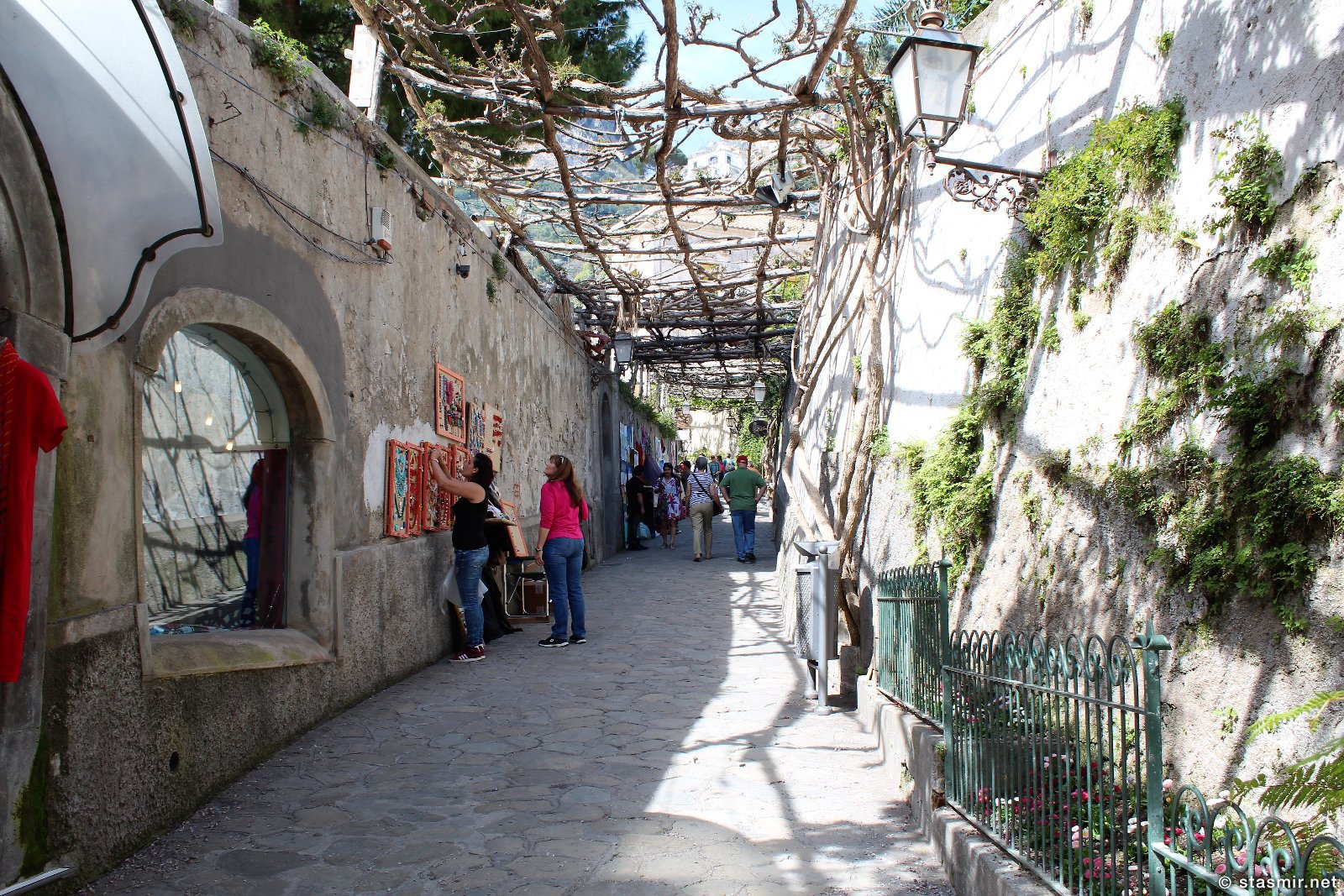 Ещё одна отличительная черта субботнего туриста — столбенеть перед витринами. Оно и понятно – в Позитанкино полным полно всяких крошечных магазинчиков и забегаловок, где столько всего умопомрачительного продают, начиная от декоративных свечей в форме тортов или цветов, и заканчивая абсолютно оригинальной одеждой местного производства (никакого Луи Виттон и Феррагамо!!!), что не остановиться и не поглазеть – просто грех. Только вот встанет такой «субботник» перед витриной в переулке шириной в метр, причём не один, а всем семейством по цепочке, упрётся кулачками в бока, чтобы удобнее было — и пошли комментарии, а ты стоишь сзади, и ни пройти – ни проехать – ни протолкнуться, и совершенно бесполезно пытаться привлечь его внимание отчаянными кличами – «субботник» глух по своей натуре.