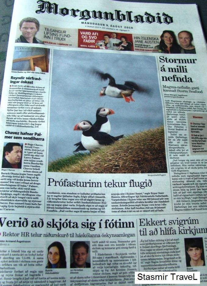 А в вопросах поэтически-романтических в Исландии, безусловно, лидируют тýпики – комические пичужки с красным носом и подведенными, как у мима (или гея?), глазами, о судьбе которых и повествует первая страница «Morgunblaðið». “Тупик, которого иногда величают «деканом» (не в смысле университетского чина, а в смысле настоятеля протестантской церкви), и которого считают самой доброй и верной птицей в мире, романтичен во всем,” – утверждает эта исландская «Правда» – чуток-другой официозное издание, главным редактором которого является ныне опальный, а в прошлом бессменный (как Леонид Ильич), премьер Д. Оддссон.