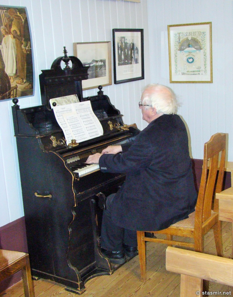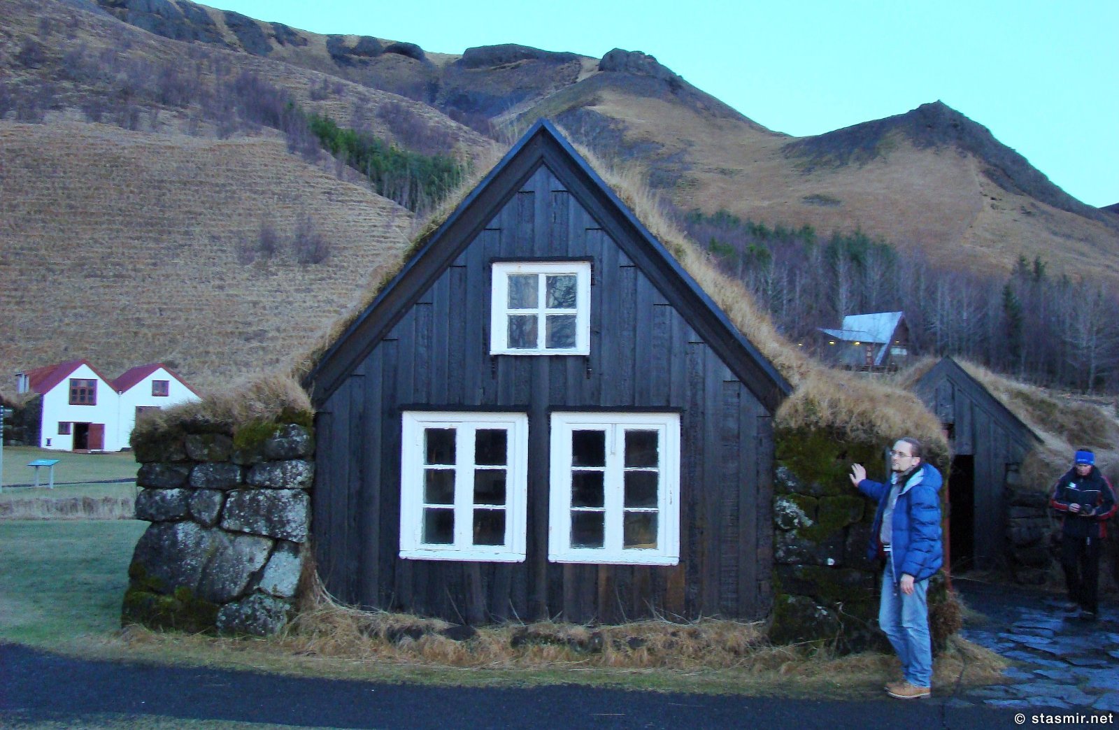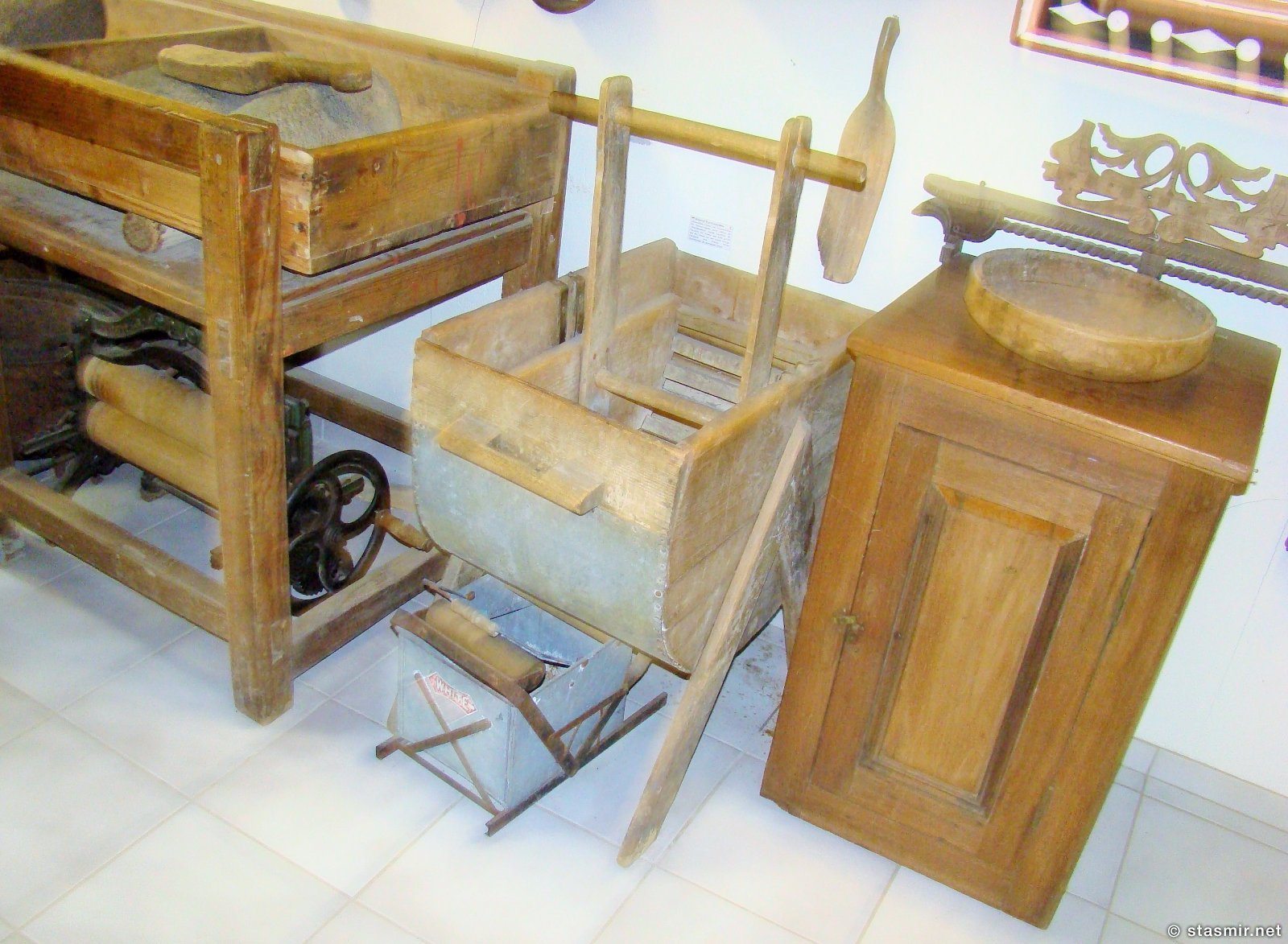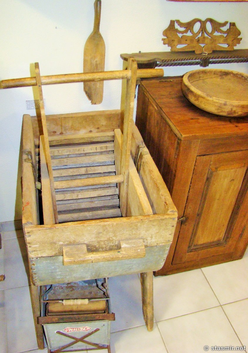 Скорость реакции у меня – как у исландского кролика, фотографически воспетого Русляндцем. Но все-таки в творческий диалог с вышеуказанным авторитетным автором не вступить не могу, поэтому публикую СВОИ ФОТОГРАФИИ пресловутой исландской стиральной машины (вверху: действительно, похожа на люльку младенца), а также УТЮГА (внизу). Представлены в краеведческом музее «Скоугасапн«. Оба изготовлены из топляка, прибитого к берегами Исландии и, говорят, берущего начало в великих сибирских реках. Стиральная машина работает без всякого привода, даже эко-френдлиевого гидроэлектрического: просто два деревянных полу-диска, приводимые в движение мускульным усилием, а между ними одежда – стремительно истончавшаяся, полагаю, учитывая интенсивность трения. Впрочем, если одежда была шерстяной, то ее высокая расходность исландцев не пугала. В стране, где на ценные кожаные ботинки сверху надевали шерстяные носки – чтобы сберечь кожу, никто по «с паршивой овцы хоть шерсти клок» скупой скандинавской слезы лишний раз не ронял. Еще возникло подозрение, что модное сочетание валяной шерсти с кружевами, уже не первый сезон царящая на мировых подиумах, зародилось именно в представленной ниже исландской стиральной машинке: из нее шерсть вылезала в клочья вперемешку с кружевами. Процесс этот, как мне подсказали, сегодня называется НАНОФЕЛТИНГ!