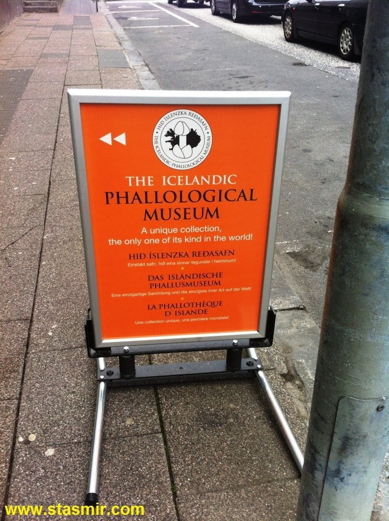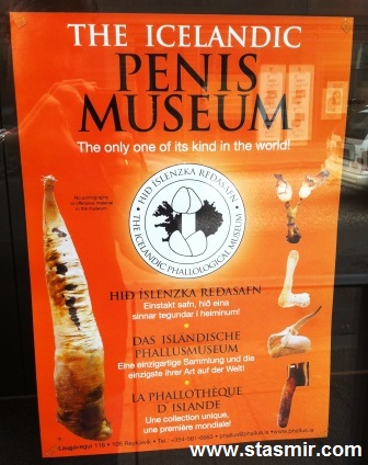 Как и повсюду в Исландии акцент в музее делается на слове «исландский», которое манерно пишется с упраздненной в ходе реформы тамошней орфографии буквой «z» – вероятно, чтобы подчеркнуть старомодно-консервативную природу коллекции. Имеются и иноземные экспонаты (разумеется, уступающие исландским по величию, глубине и духовности) – например, пенис африканского слона и, если я правильно помню, член иберийского быка. Отдельная часть коллекции посвящена причинным местам героев исландского фольклора, таких как тролли, эльфы и мужчины-русалки (русалкманы?). Представлена также ялдá злого духа полуострова Снайфедльснес и «прибор» одного из 13 исландских «йоласвейнов» – шалопаистых парней, возвещающих приход рождества на остров. Если с мишкой все ясно – имел неосторожность подплыть к Западным Фьордам на льдине, его подстрелили и выполнили обрезание – то в отношении «йоласвейнского» хрена встают вопросы. Он все-таки штучный персонаж: как он теперь без «гордости» и «достоинства» справляется с выполнением своих рождественских функций? Впрочем, все мифологические существа в Исландии определяются как «хюлдуфоулк» – невидимые существа – и потому всегда можно сослаться на то, что детородные органы у них тоже невидимые. Прикрепил к пустой полочке ярлычок «Лингам злого духа» – и показывай себе воздух!
