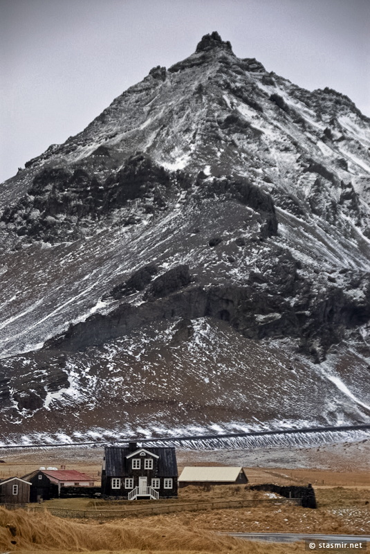 На фотографии «Амтманнсхус». Когда слышишь это чарующее сочетание звуков, сразу хочется затянуть «Ой, да батька атаман!». Амтманнсхус — это резиденция датского префекта в рыбацкой деревушке Арнарстапи (что переводится как «орлиный утес») в западной части полуострова Снайфедльснес. Здание построено в 1774 году и является типичным представителем старшего поколения исландской архитектуры: деревянный дом покрыт смолой, чтобы сберечь его от соленой морской стихии. За звание самого старого из подобных домов в Исландии в этой категории соперничает здание краеведческого музея в Исафйордюре (1734 год постройки) и дом, незатейливо именуемый просто «Húsið» (то есть «the дом»), в Эйрабакки, который прибыл в Исландию в 1765 году. Как и все дома эпохи дерева, их привезли на остров через океан. Свой лес в Исландии когда-то был, да, как говориться, сплыл: за первые три столетия после поселения все исландские деревья то ли порубили люди, то ли погрызли привезенные ими бараны, то ли поморозил нагрянувший в позднем средневековье ледниковый период. Поэтому на протяжении веков исландцы ютились в крытых дёрном землянках. Более поздние деревянные дома, ввозимые из Норвегии, уже не смолились, а покрывались профлистом: также для продления ресурса дерева во влажном морском климате.