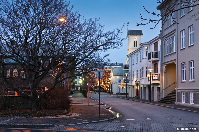 На фотографии можно различить сад здания исландского парламента, которое было возведено в 1881 году из исландского долерита. Справа на фотографии — замечательный рыбный ресторан «Við Tjörnina» («У озера»). Садик Парламента открыт для широкой публики и очень мил: у меня имеется исландский знакомый, который в молодости находил особую прелесть в том, чтобы в пятничную ночь «народных гуляний» курнуть табачка или даже «косячка» в парламентском саду. Пописав на дверь Парламента, разумеется, что многие горожане не упускают возможности сделать. Исландцы, кстати, отвратно свинячат в центре города в ходе ночных попоек, приходящихся на каждую пятницу и субботу, но заступающие рано утром на службу мощные пылесосные машины поглощают весь «срач» еще до того, как выйдет из дома за свежими булочками первый рейкьявикский пенсионер.