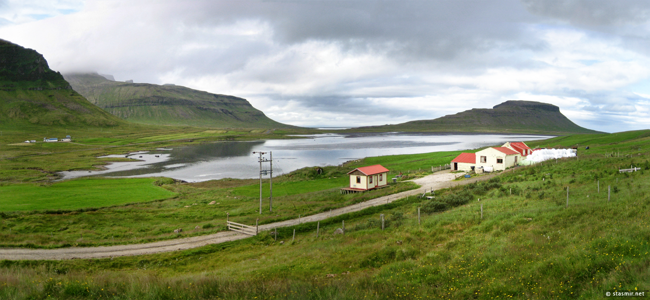 На снимке хозяйственная часть фермы на полуострове Снайфедльснес, видная из расположенного выше великолепного коттеджа с фантастическими видами на фьорд и гору Киркйюфйадль. Если захотите найти этот коттедж — свяжитесь со мной.