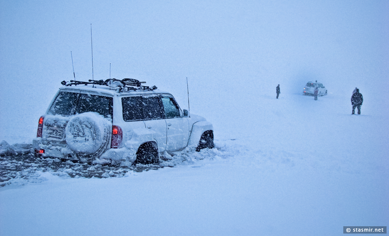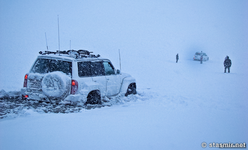 «Джипáк» — это не имя болливудского актера (Джипáк Чопра) или афганского премьера (Джипáк Кармаль), а почетный титул заслуженного внедорожника. На снимке — начало спасательной операции одного «Патруля» другим при помощи лебедки «и какой-то матери». Джип «Патруль» провалился в лед по самые порожки и намертво засел на зимней дороге в Landmannalaugar; попотеть в ледяной воде пришлось изрядно.