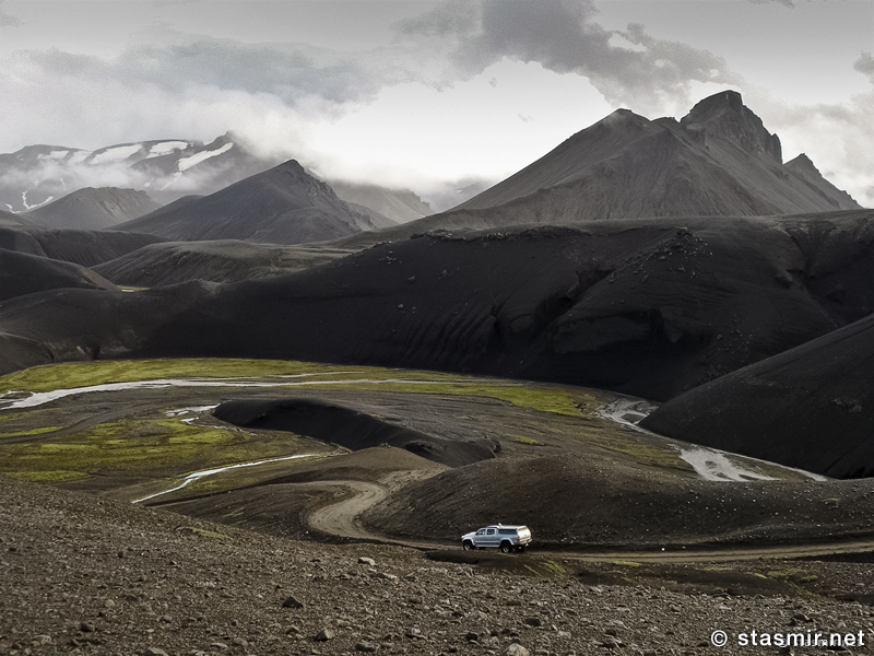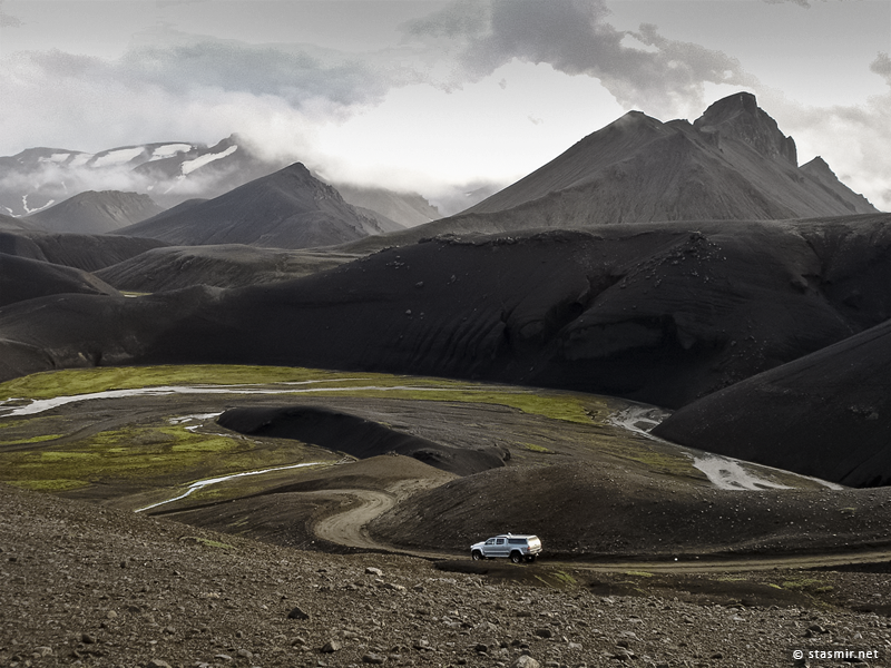 Все 58 километров горной трассы F-208 мучительно тянутся по крутому серпантину без покрытия и ограждений. Значительная часть пути проходит на порядочной высоте над уровнем моря, а облака здесь лежат низко, так что поездка происходит в густом тумане и холодном поту: страшно подумать, с какой высоты можно свалиться, не заметив поворот. Я считаю себя изрядным знатоком исландского бездорожья, но побаиваюсь участков с ограниченной видимостью. На асфальте, впрочем, тоже бывает страшно на перевалах, где стоят плотные туманы – например, в Восточных Фьордах.