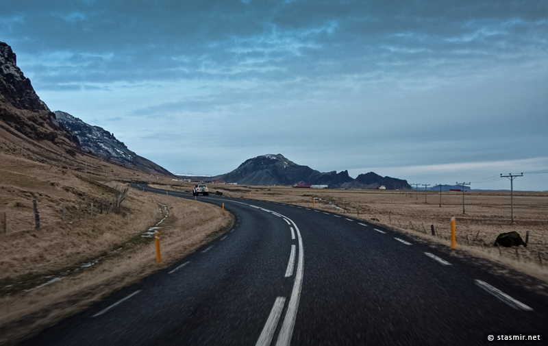 Зимняя дорога номер один, опоясывающая большую часть острова. Протяженность дороги — 1339 км. Ее завершили в 1974 году — в ознаменование 1100 лет заселения острова. Дорога минует самые живописные места в Исландии — полуостров Снайфедльснес, Западные и Восточные Фьорды, но соединяет Рейкьявик с северной столицей — Акюрейри. Фотография сделана по пути в Вик — самую южную точку Исландии. Вдали вырисовывается живописный полуостров Dýrhólaey («дверной проем»), а слева над дорогой начинает нависать Эйафйадлайокудль.