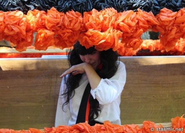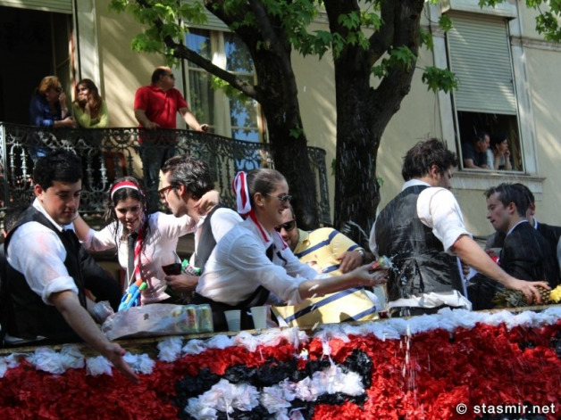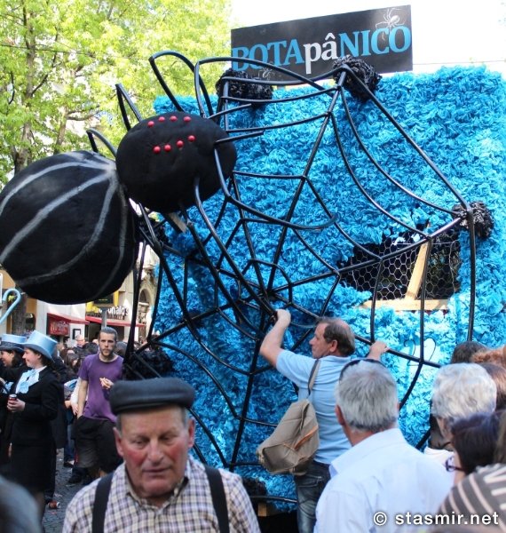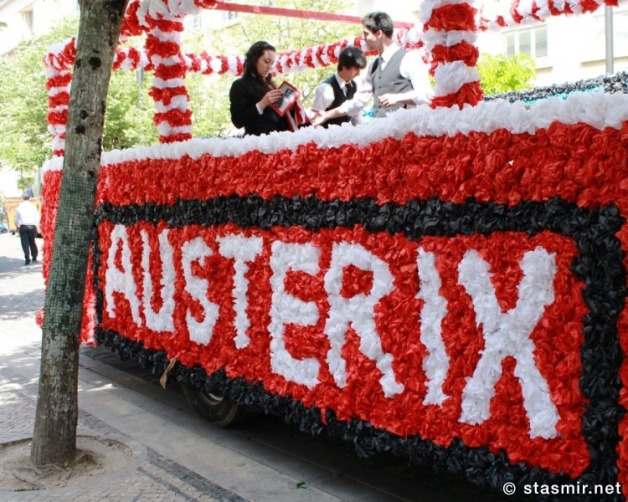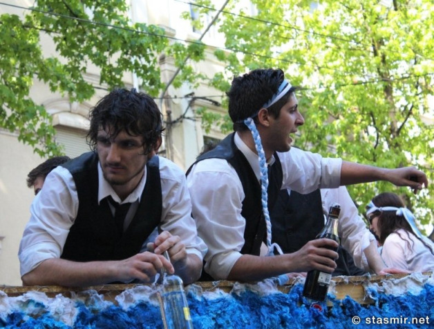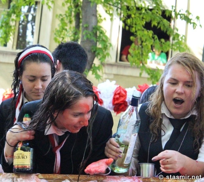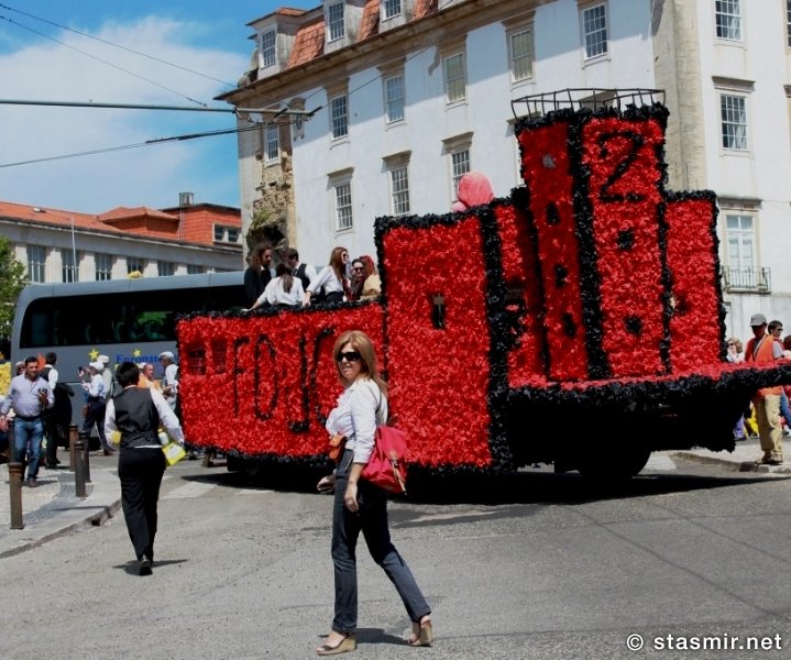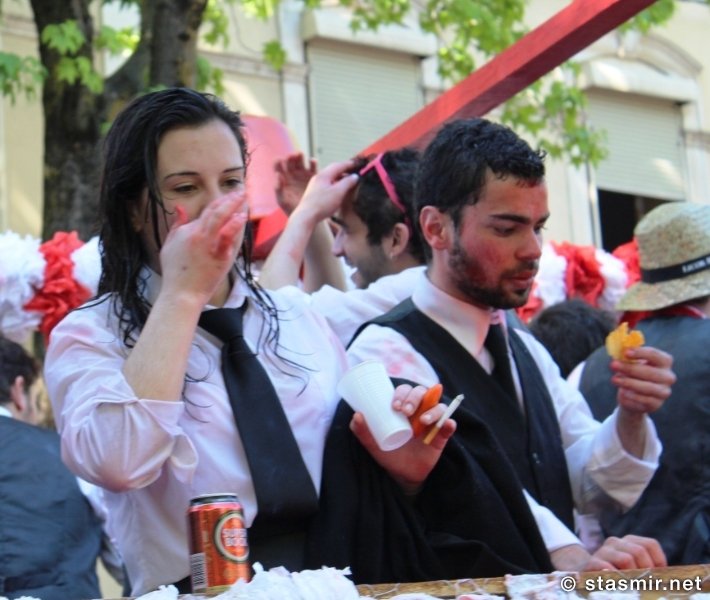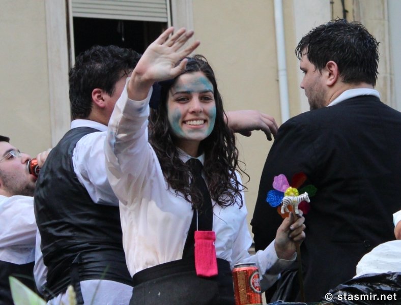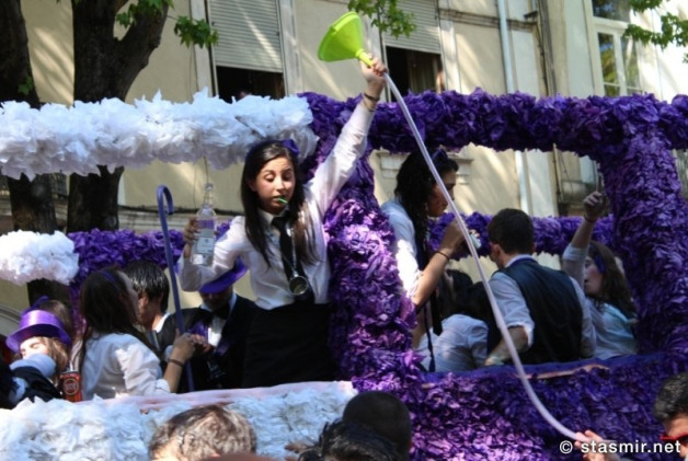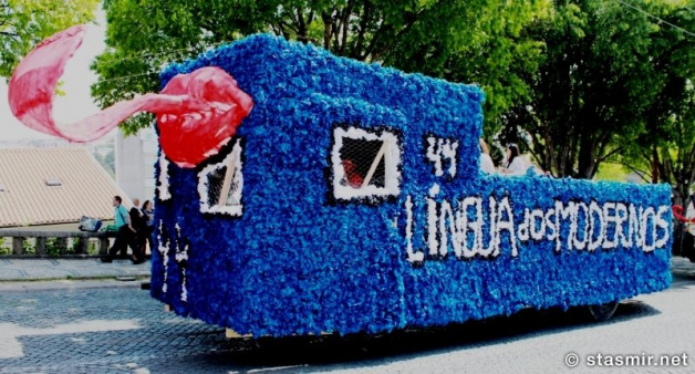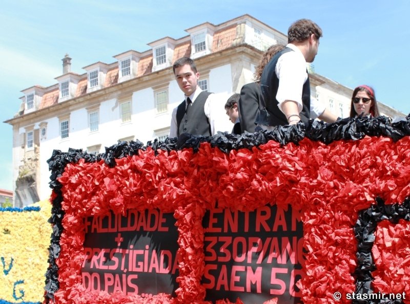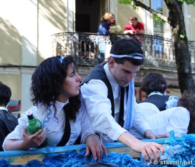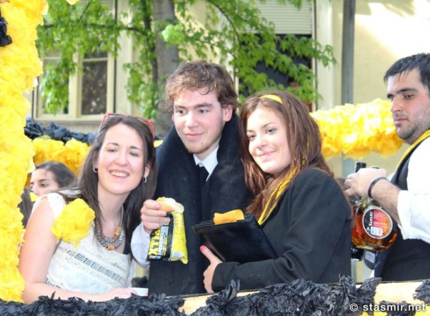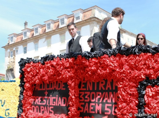Зато посчастливилось наблюдать «o cortego» – процессию из украшенных бумажными ленточками и полит-академической сатирой «флоташ» (плотов). «Флоташ» представляют собою расфуфыренные до неузнаваемости грузовики, в кузовах которых «зажигают» студенты, главным образом потребляя и выливая в толпу реки алкоголя. Живописная процессия «плотов» и освободившихся от лекционного гнёта студентов плавно течет из верхнего города (Alta) в нижний (Baixa).