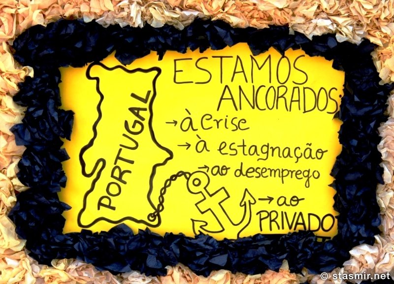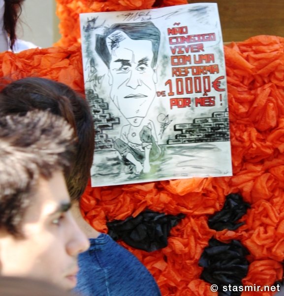 Многие плакаты жаловались на навязанный «Тройкой» аскетический режим «austeridade», который у нас обычно переводится как «режим жесткой экономии». «Тройка» упоминается в португальских СМИ также часто, как США в российских, отчего возникает устойчивый образ некого неправедного союза иноземных держав, навязывающего бедняжке Португалии свою злую волю. На самом деле «Тройка» — это не Германия, Франция и, скажем, Голландия, а Европейская Комиссия, Международный валютный фонд и Европейский Центробанк, которые действительно требуют от страны снизить бюджетный дефицит, чтобы не «уронить» евро.