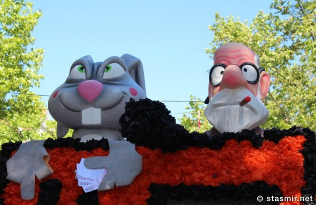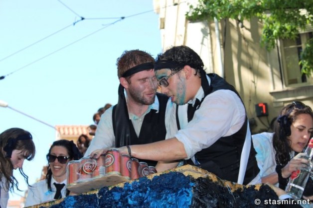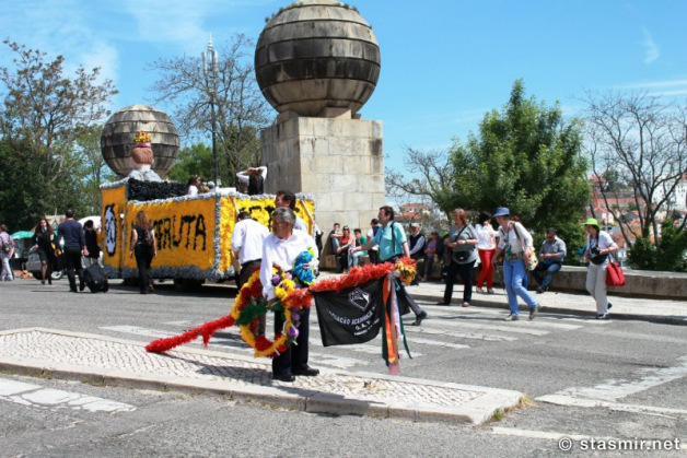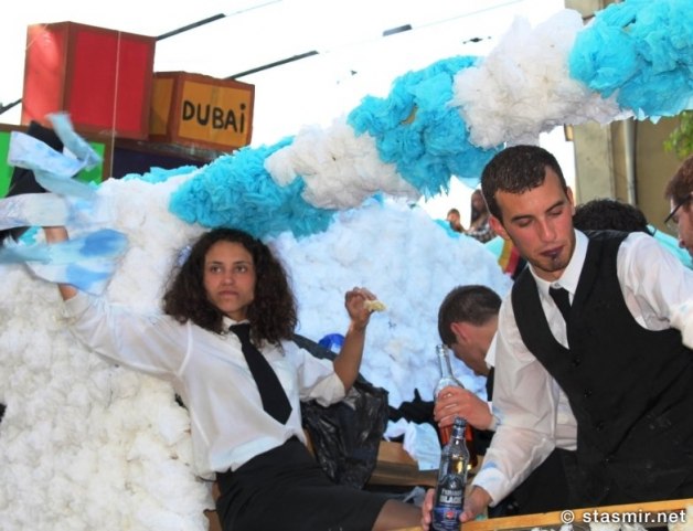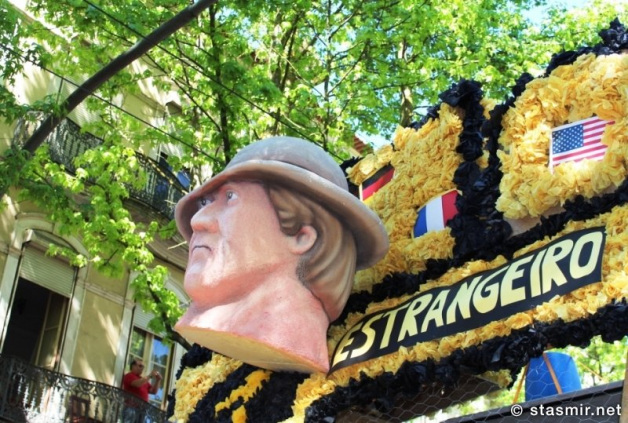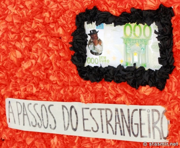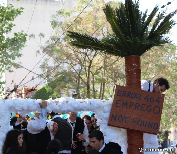 Я уж не знаю, что там крепче вставляет, но вот что примечательно. Помимо бесчисленных ящиков пива, «плоты» по давней студенческой традиции несли в массы обойму за обоймой политической сатиры. Среди политических плакатов преобладали инфантильные по ощущению собственной исключительности угрозы «свалить в эстранжеиру» (заграницу), если Португалия не одолеет кризис и не осилит безработицу. Сейчас: страна затрепещет, услышав, что еще один выпускник факультета бизнеса и администрации уезжает на заработки во Францию.