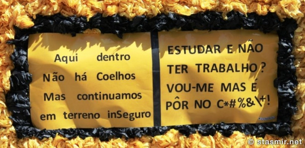 Досталось и другому политику – Антониу Жозе Сегуру, чья фамилия обыгрывается в слове «inSeguro» (небезопасный): «Здесь внутри нет кроликов-Куэлью, но мы остаемся на небезопасной территории. Учиться и не иметь работу? Блин!».