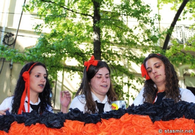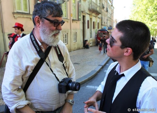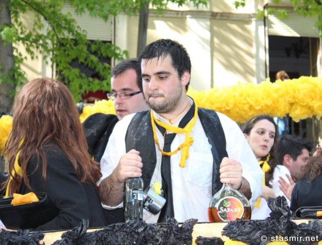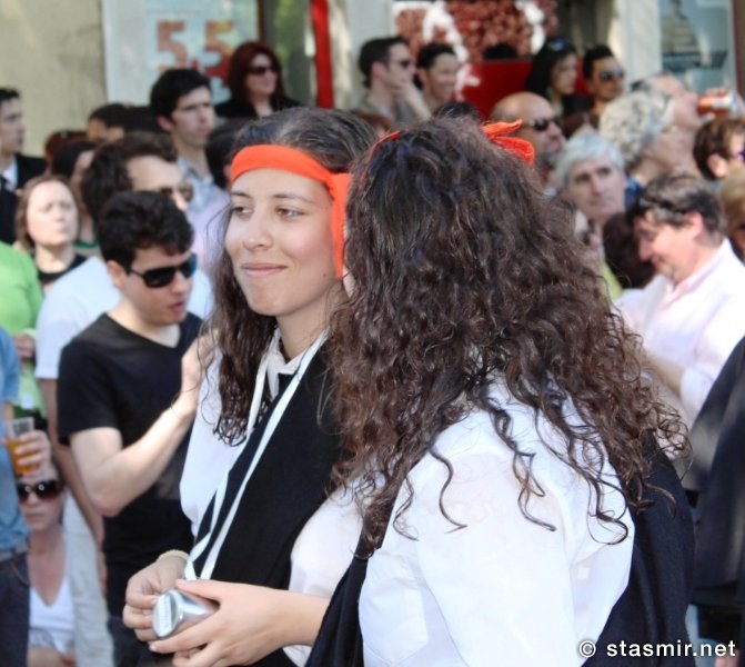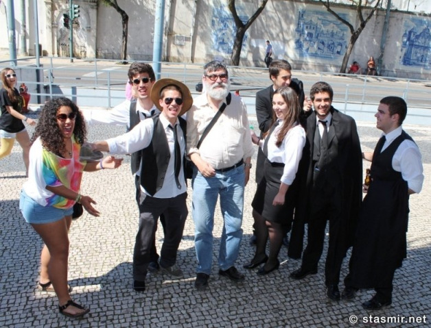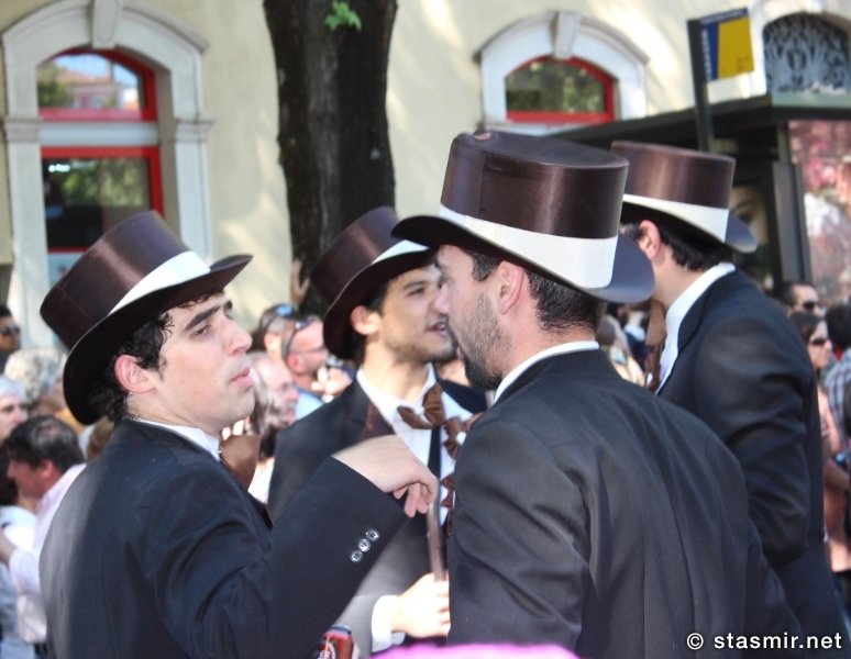 Если есть просьба, на которую любой португалец откликнется с охотой, бросив даже самое срочное дело, так это просьба показать, где можно хорошо и дешево покушать. С помощью прохожих мы нашли «лучший» ресторан в городе (не сильно отличавшийся от другого «лучшего» ресторана по соседству), плотно пообедали и изготовились ждать начала парада. Наш эрудированный проводник – известный историк и журналист Жозе Милязеш, недавно награжденный Президентом Португалии высшим орденом за гражданские заслуги – пользовался пристальным и несколько бесцеремонным вниманием подвыпивших студентов, которое принимал с характерным для португальцев старой школы сдержанным достоинством.