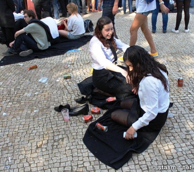 Я называю триумфально идущую по улицам Кимбры молодежь «недовыпускниками» потому, что в Коимбре студенты отмечают не сдачу экзаменов, а окончание лекционного цикла – своего рода «последний звонок». В этом отношении сжигание ленточек с пожеланиями, которое, насколько мне известно, сегодня не практикуется, имеет ритуальный смысл. Студенческие гуляния продолжаются целых восемь дней (тоже по числу факультетов) — время, когда надо зубрить, а не выпивать! Да помогут ребятам их ленточки и португальская «Дейшалла» — исковерканное арабское «Инша Алла». Дай Бог! А не даст, так они гульнут еще раз в следующем году!