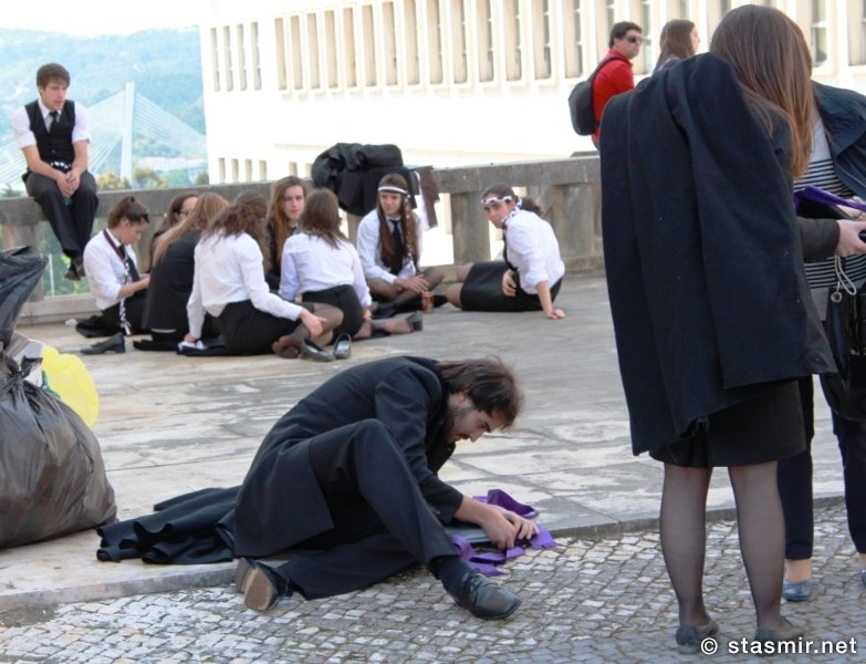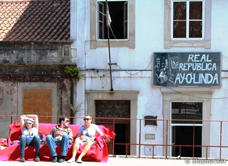 Поинтересовавшись у студентов, когда начнется процессия, мы получили неуверенный ответ: то ли в три, то ли в шесть. Прошлись по городу. Если в США студенты селятся в так называемых «fraternity» (братствах), каждое из которых по традиции названо сочетанием из непостижимых для англосаксонского ока греческих букв, то в Португалии аналогичные сожительства «frat boys» незатейливо зовутся «repúblicas». Задумка та же, что в США – смешать богатых с менее состоятельными «студнями» в едином порыве совместного общежития, зубрежки и пьянки, повышая таким образом социальную мобильность молодежи.