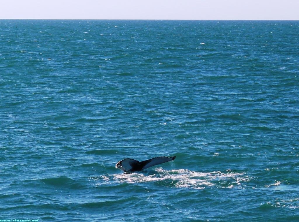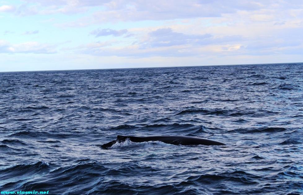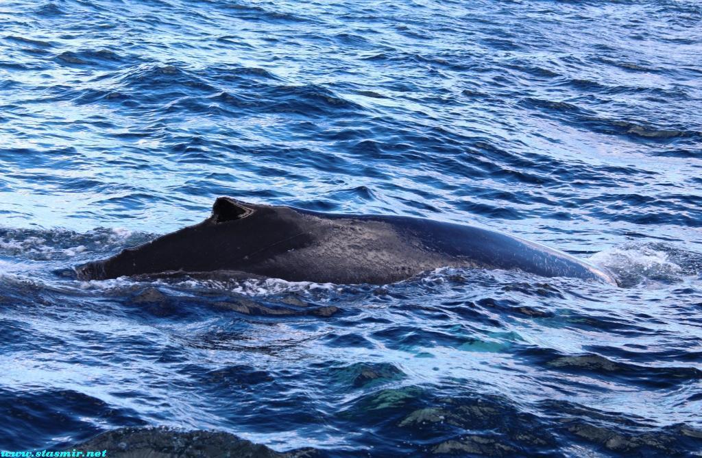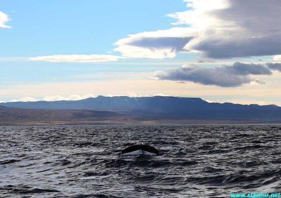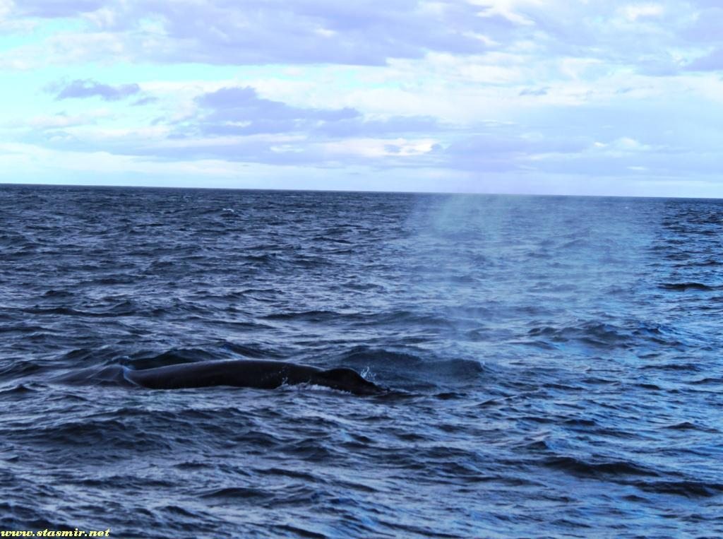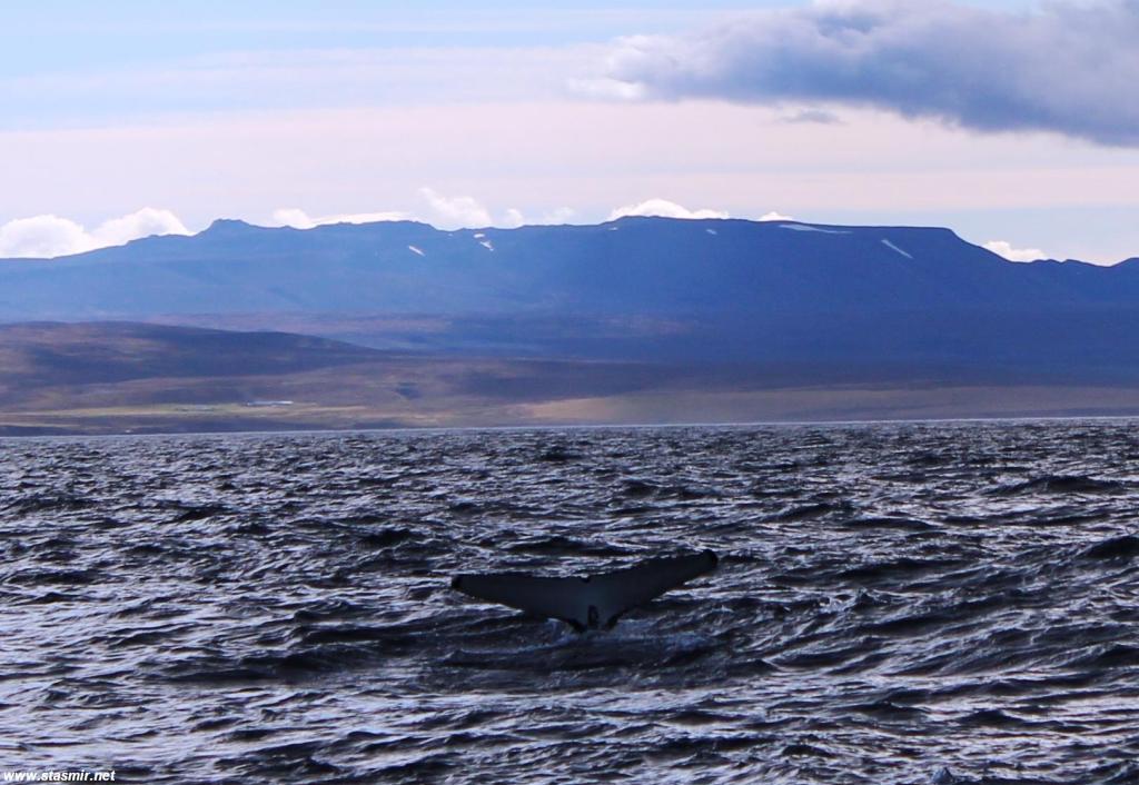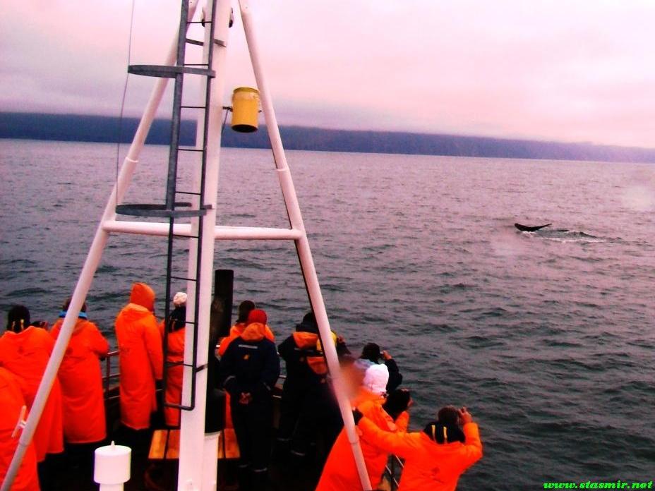 Мы приближаемся к месту кормления китов в самой глубокой части фьорда. Совладав с морской болезнью, туристы по достоинству оценивают преимущества парусного перехода. Шхуна идет с постоянным глубоким креном, но тело привыкло к нему, налилось упругой силой. По сравнению с парусником моторное судно ведет себя непредсказуемо и хаотично. Ветер и арктическое солнце зарумянили наши счастливые лица. Начинается погоня за китами, которые сегодня только хороводов вокруг шхуны не водят. Слышен треск эфира: капитаны обмениваются координатами. Мы всматриваемся в серые дали. Вдруг неподалеку раздается фырканье и поднимается фонтан зловонного дыхания. «Горбатый кит на половину четвертого» – вещает в микрофон Дуня. Все бросаются к правому борту наблюдать очертания китового тела под шхуной. Горбатый плывет параллельно шхуне, потом уходит под воду, взмахнув на прощание хвостовым плавником. На хвосте белое «оперенье», узор которого уникален: по таким узорам биологи различают особей. Бывает, что исландский кит покажется где-нибудь на Азорах: туристов просят присылать свои фотографии китов, чтобы исследователи могли занести их в базу.