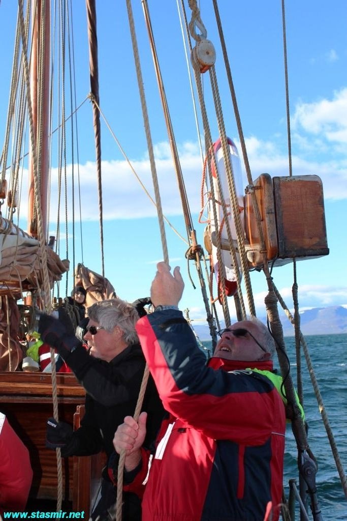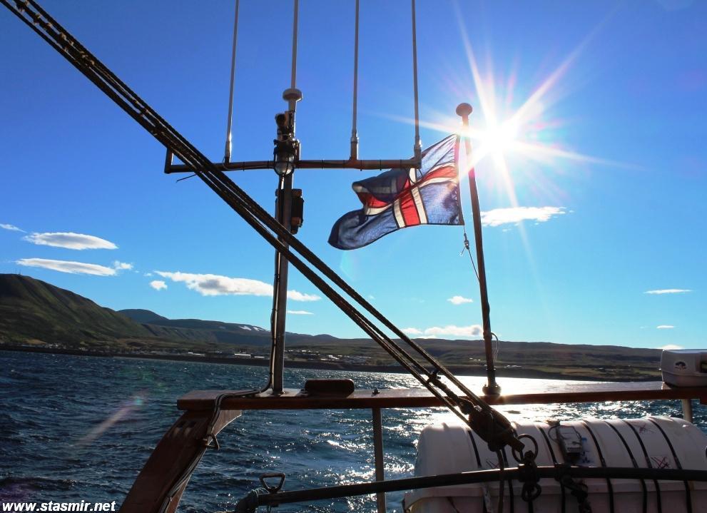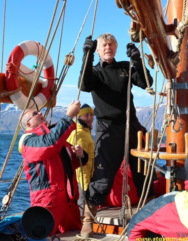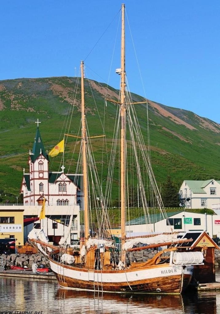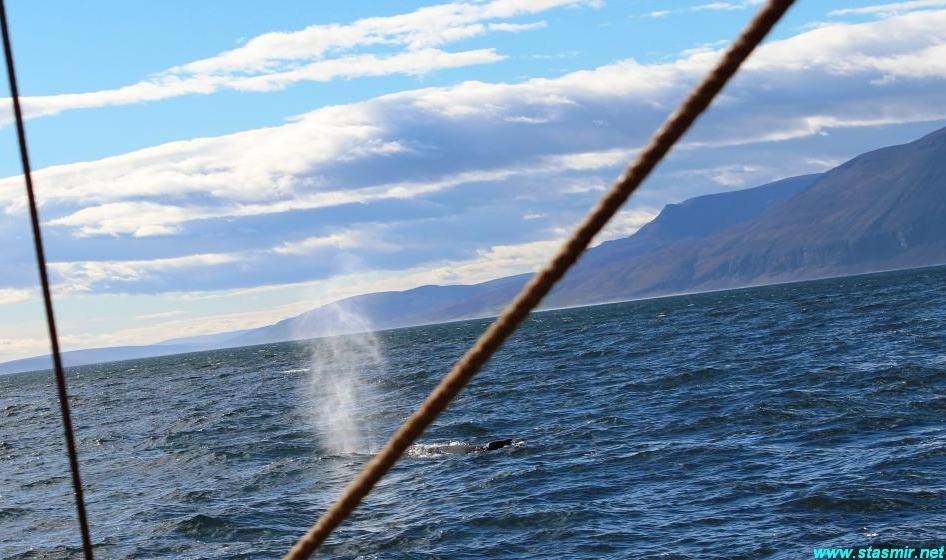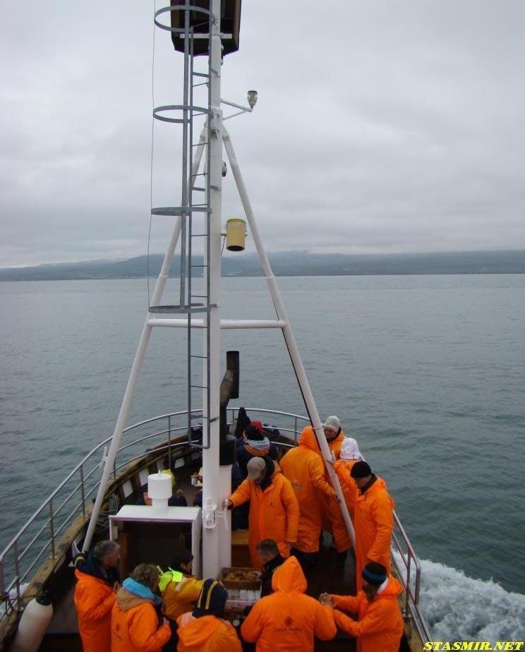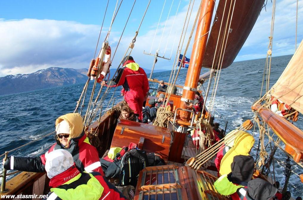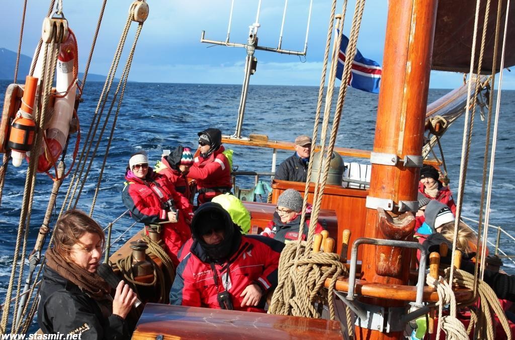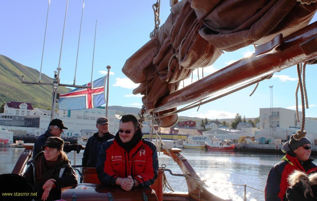 День выдался пасмурным, и мы плещемся в «силиконовых» водах Природных купален озера Миватн. К нам подходит хозяин «North Sailing» – человек с повадками корсара и негибким именем «Hörður» («твердый»). Мы мало похожи на экстремалов, но он предлагает нам идти в море не на обычном моторном судне, а на шхуне под парусами. «Качать сильно будет?» – в тревоге спрашиваю я. «Напротив, – отвечает Хёрдюр – моторное судно сильнее бьёт волною, к тому же под парусом не будет вонять мазутом». Посоветовавшись с исполненными безрассудного оптимизма туристами, я соглашаюсь. Крепыш Хёрдюр, которого я называю про себя «Prince of Whales» (созвучно «Принцу Уэльскому», но переводится как «принц китов») потирает руки…