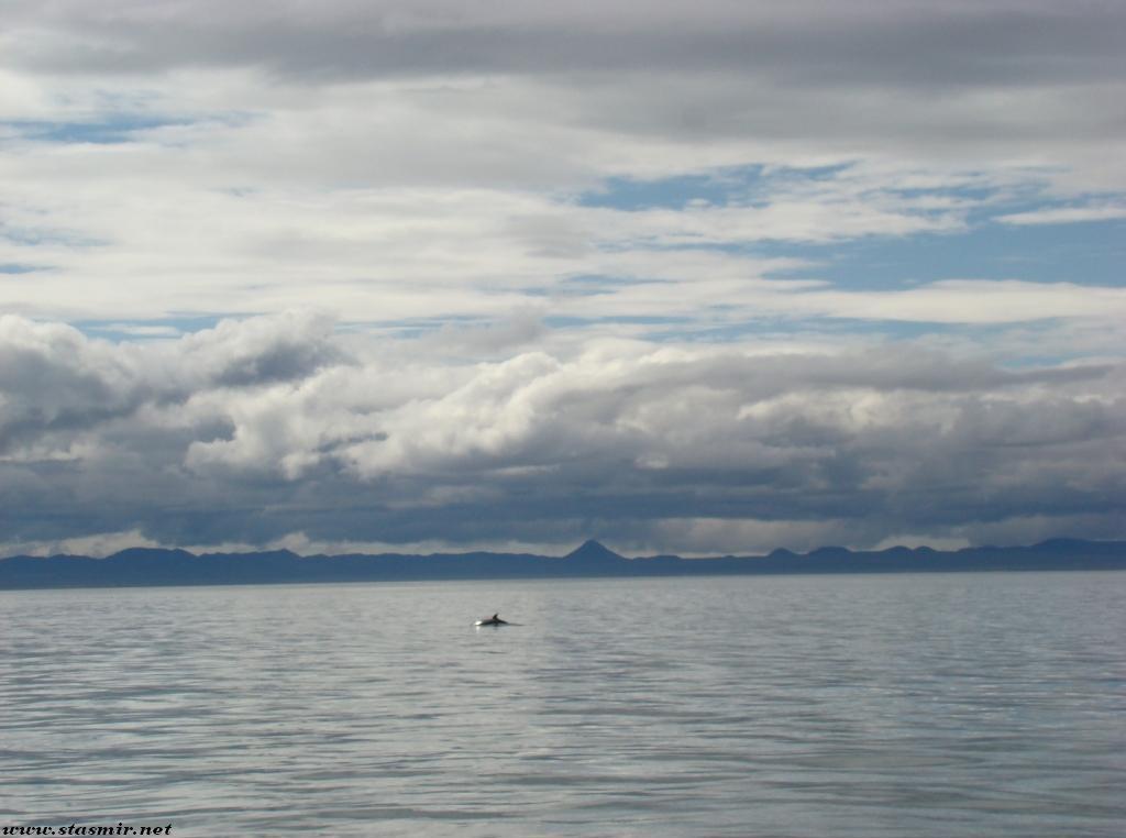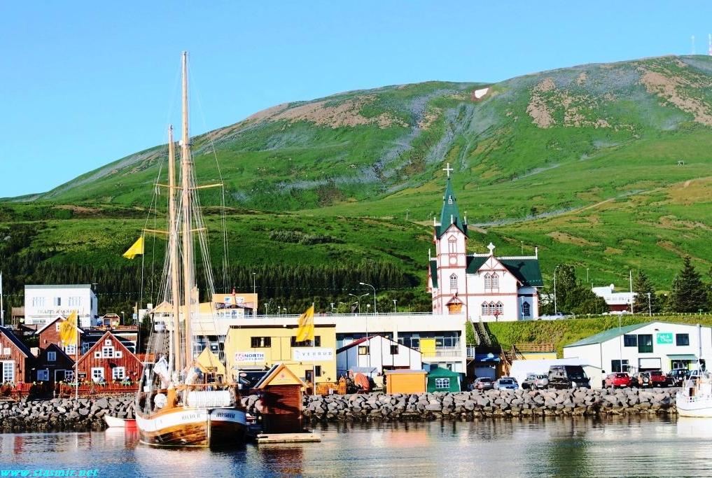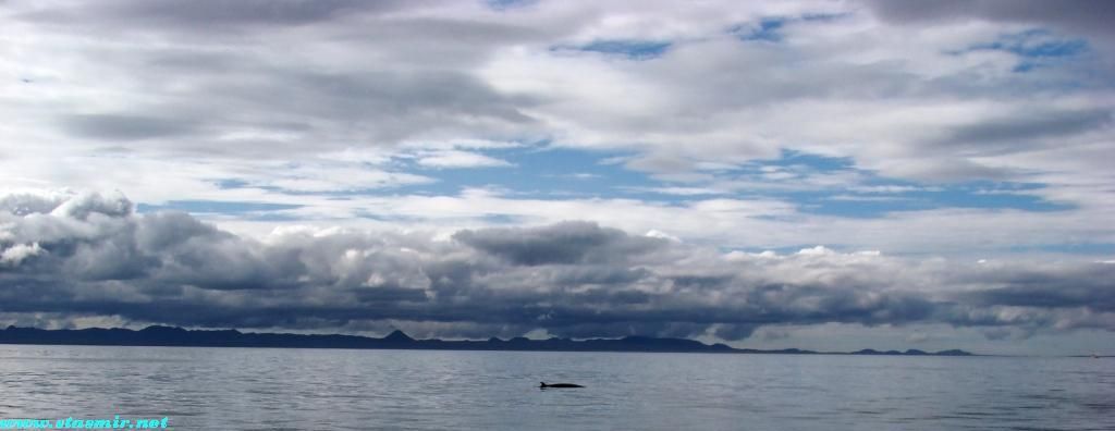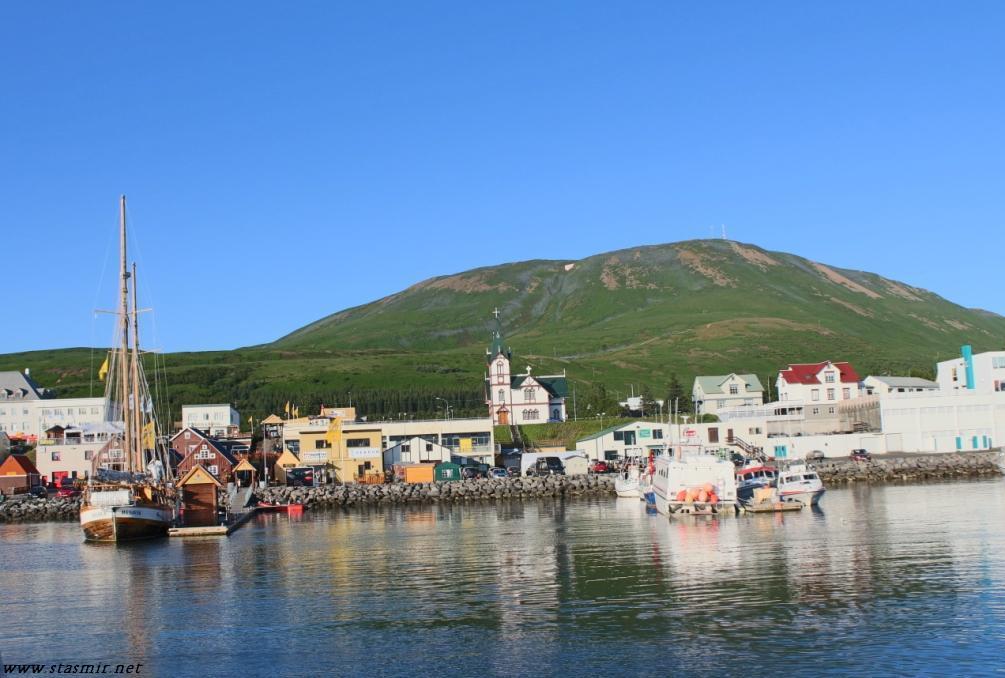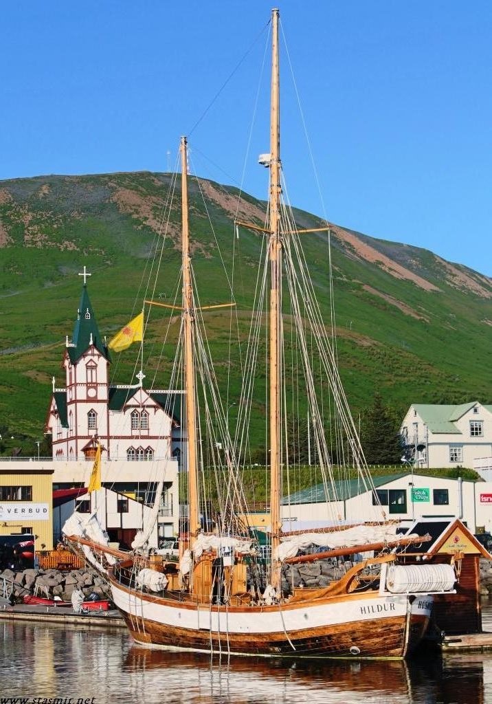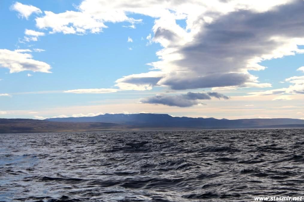 Наступает завтра, и мы мчимся с озера Миватн в Хусавик, чтобы успеть на утреннее китопредставление. Деревянная шхуна «Haukur» («ястреб») – самый красивый корабль в городе. Он построен недавно – в 1973 году, но по образцу старых рыбацких судов XIX века. День выдался солнечным, но прохладным, и нам выдают не оранжевые водонепроницаемые робы, а теплые комбинезоны на молниях. Выходим из порта на моторе. В пенистой дали стремительно исчезает шпиль кирхи Хусавика, увенчанной кельтским крестом. В качестве гида-китоведа в этот раз выступает просоленная девушка из Хорватии, которую зовут «Дуня».