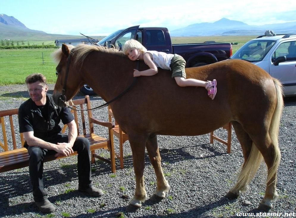 Если Вы устали от этой профессиональной «лошадистики», милости просим прямо в седло. Поверьте, для этого не нужно обладать ни теоретическими знаниями, ни практическим опытом, ни спортивной формой. Исландские лошадки весьма флегматичны и легко управляемы, покорно идут цепочкой, не рысачат, седоков не скидывают, копытами не бьют, удил не грызут. Ни с чем не сравнимое удовольствие от контакта с этим удивительным животным гарантировано и тем из Вас, кто лошадей раньше видел только по «ящику», и тем, кто с малолетства в седле, как Чингачкук Чингизханович!