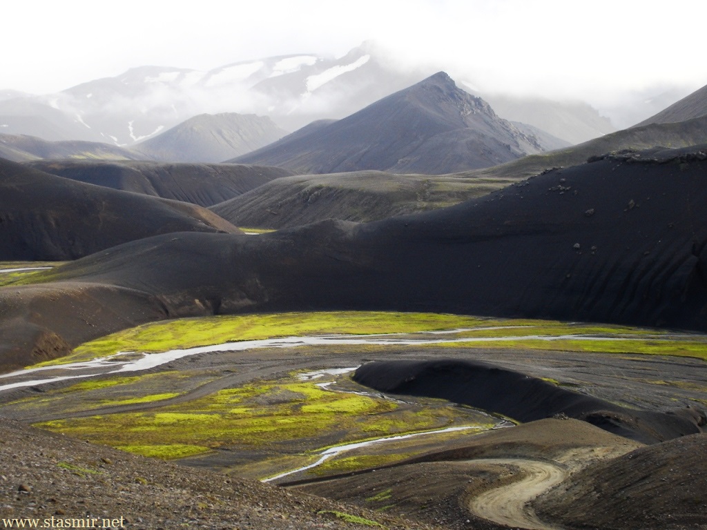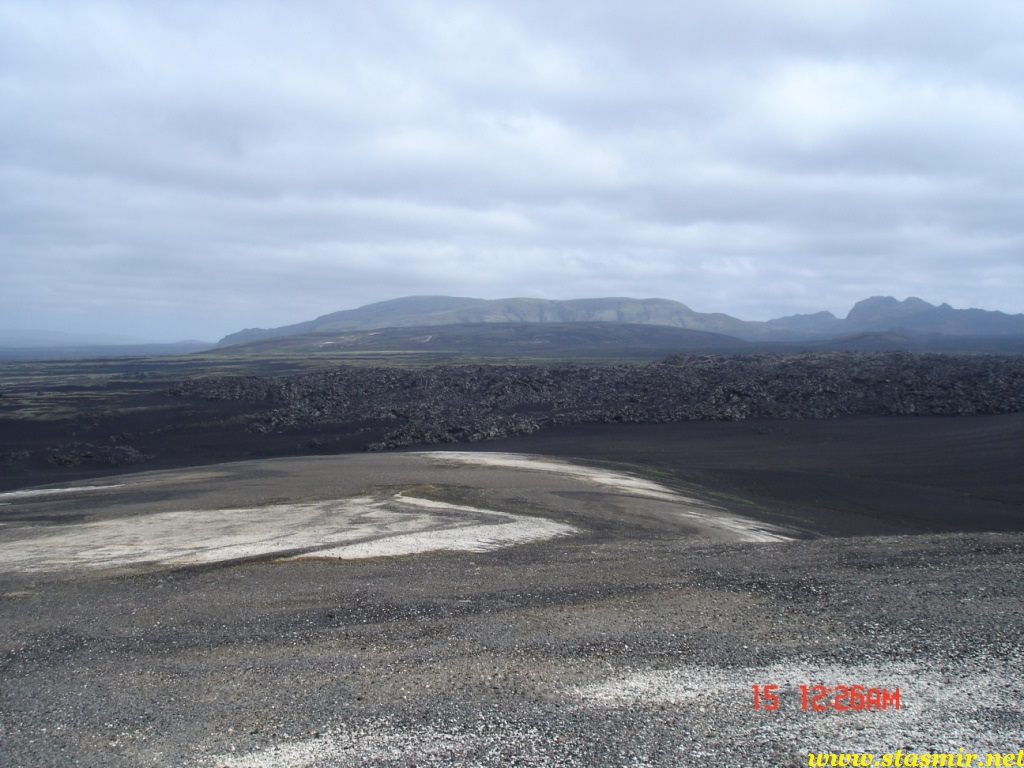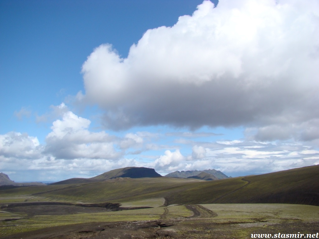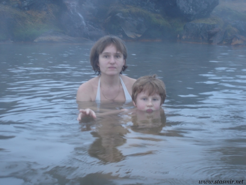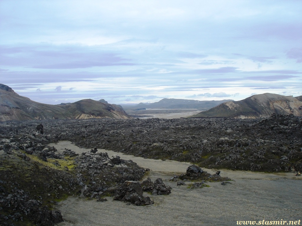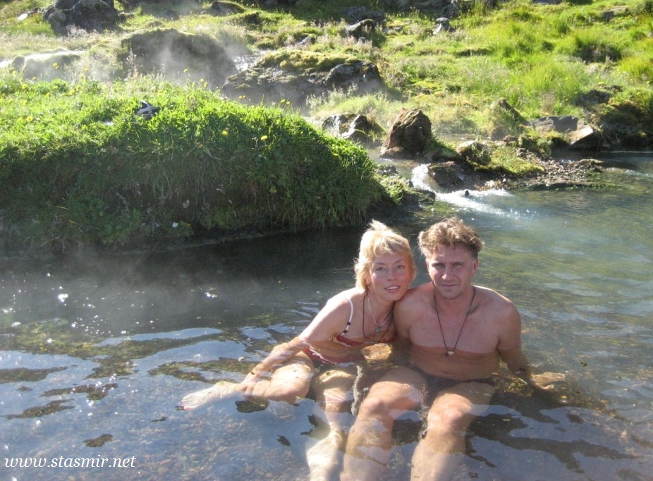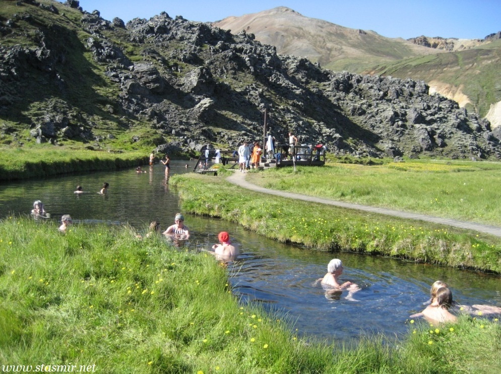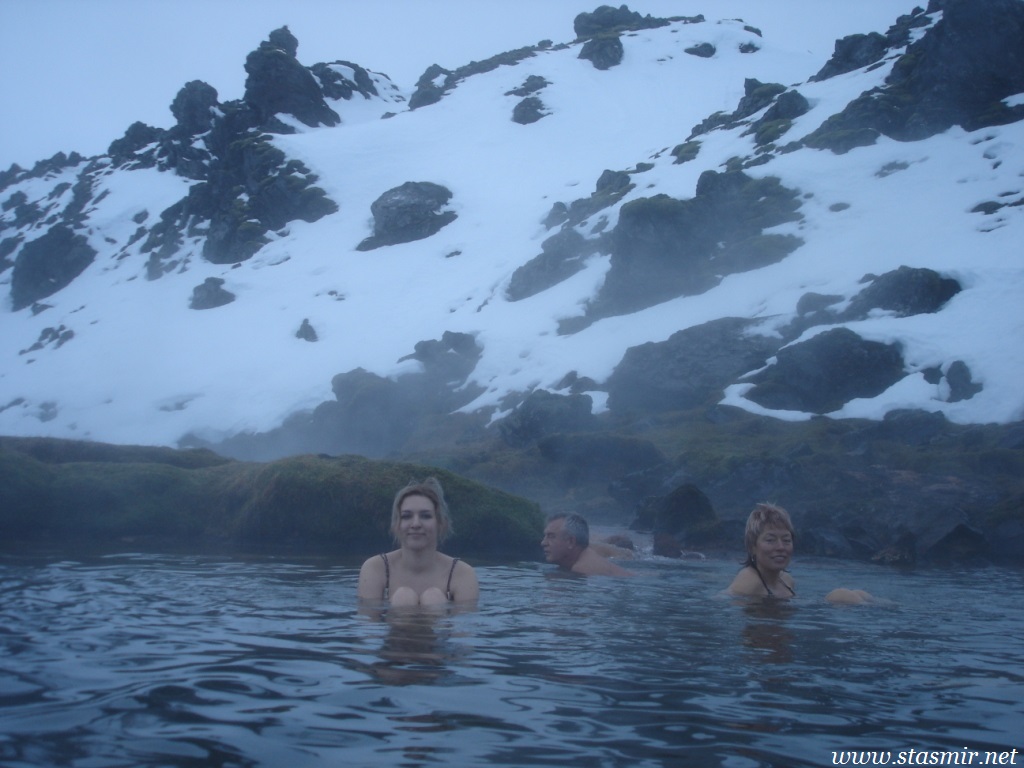 Есть и термальная речка – божественно расслабляющая, особенно в холодное время. Есть интересные места по дороге – предгорья Геклы – врата в исландский ад. Живописные водопады, которые не хочу описывать, потому считаю их своей тайной: не хотелось бы, чтобы туда приезжало столько людей, сколько ездит на Золотой водопад! Фантастические взрывные кратеры, которым исландцы дают нарочито «поэтические» имена – например, «уродская лужа». Каскады озер к северу от турбазы, где можно в полном одиночестве и за скромную плату ловит форель. «Исландские Помпеи» – ферма викинга, которую отрыли из под пепла, оставленного первым после заселения в Исландии человеком извержением Геклы. Голубые пики вдали. Тропа, названная как главная улица в Рейкьявике – Лёйгарвегур – «ручейковый путь». Она ведет от ручейков в Ландманналёйгар к перешейку между Эйафйатлаёкудлем и Мирдальсьёкудлем.