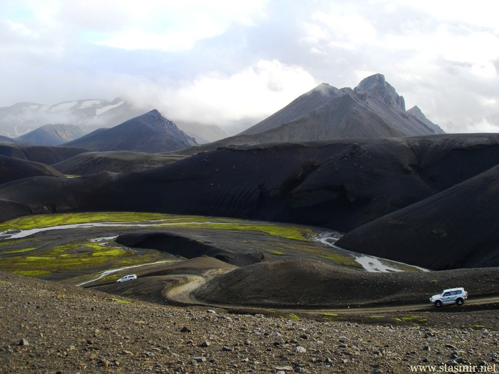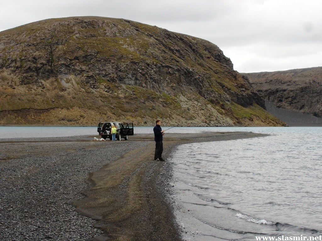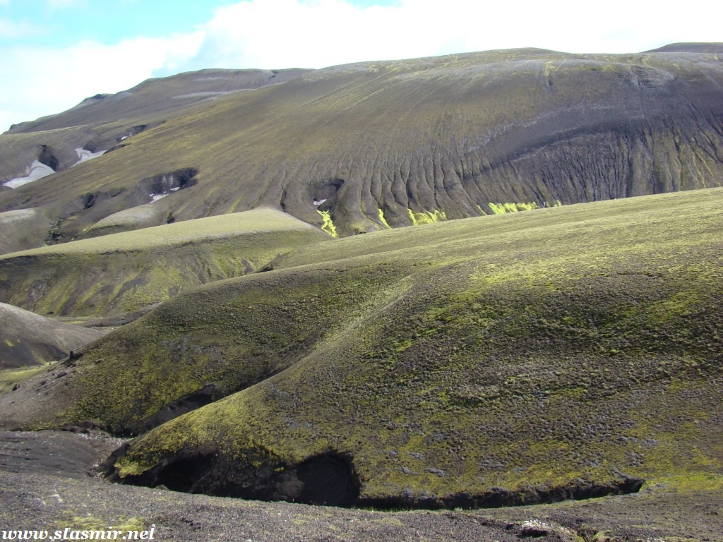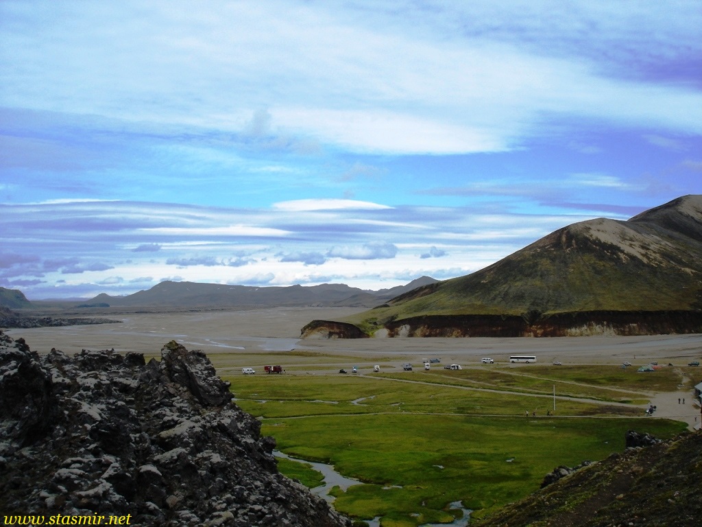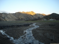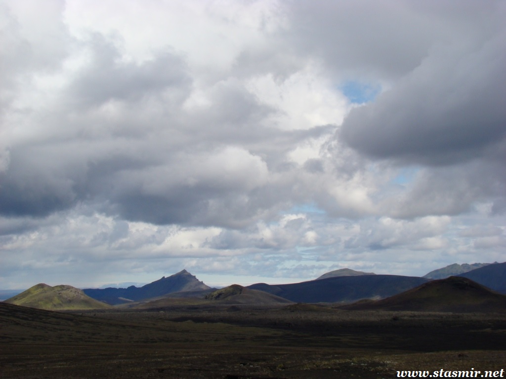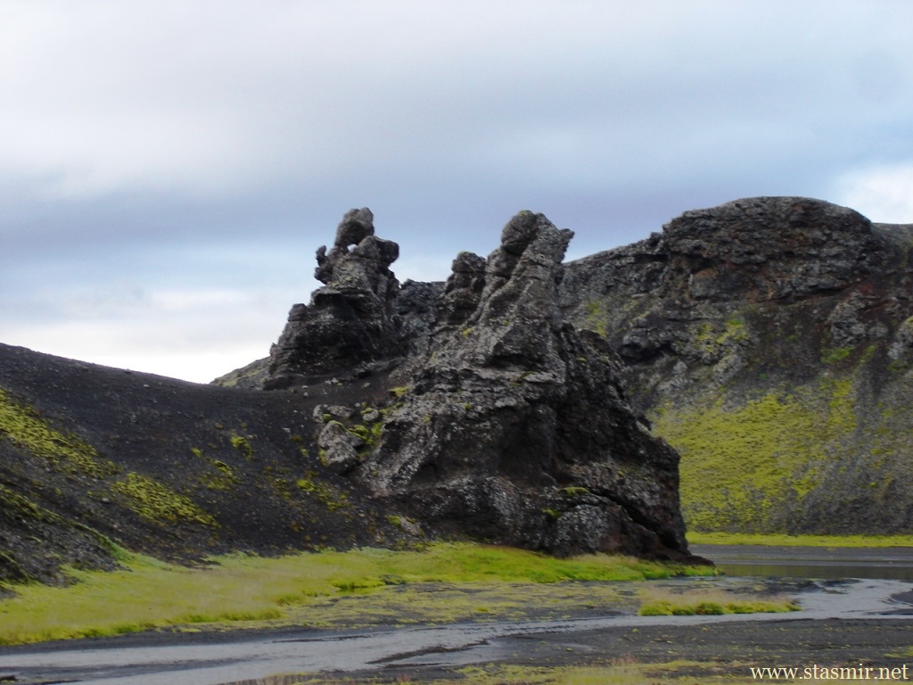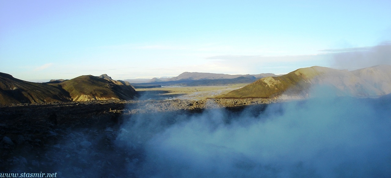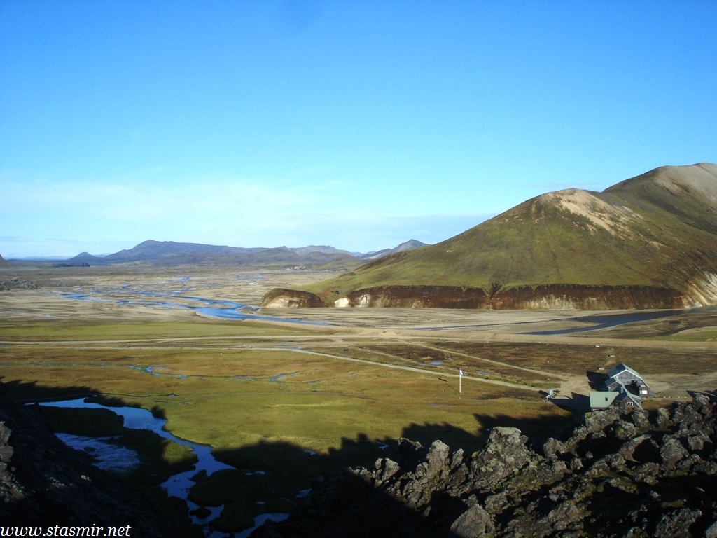 Есть и термальная речка – божественно расслабляющая, особенно в холодное время. Есть интересные места по дороге – предгорья Геклы – врата в исландский ад. Живописные водопады, которые не хочу описывать, потому считаю их своей тайной: не хотелось бы, чтобы туда приезжало столько людей, сколько ездит на Золотой водопад! Фантастические взрывные кратеры, которым исландцы дают нарочито «поэтические» имена – например, «уродская лужа». Каскады озер к северу от турбазы, где можно в полном одиночестве и за скромную плату ловит форель. «Исландские Помпеи» – ферма викинга, которую отрыли из под пепла, оставленного первым после заселения в Исландии человеком извержением Геклы. Голубые пики вдали. Тропа, названная как главная улица в Рейкьявике – Лёйгарвегур – «ручейковый путь». Она ведет от ручейков в Ландманналёйгар к перешейку между Эйафйатлаёкудлем и Мирдальсьёкудлем.