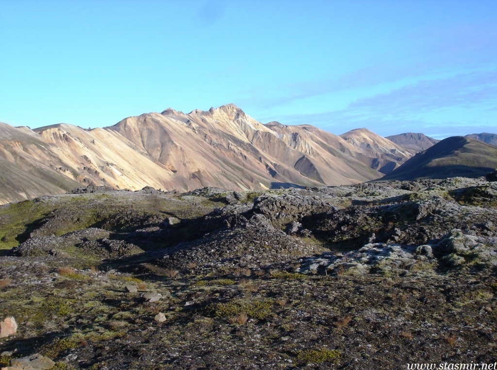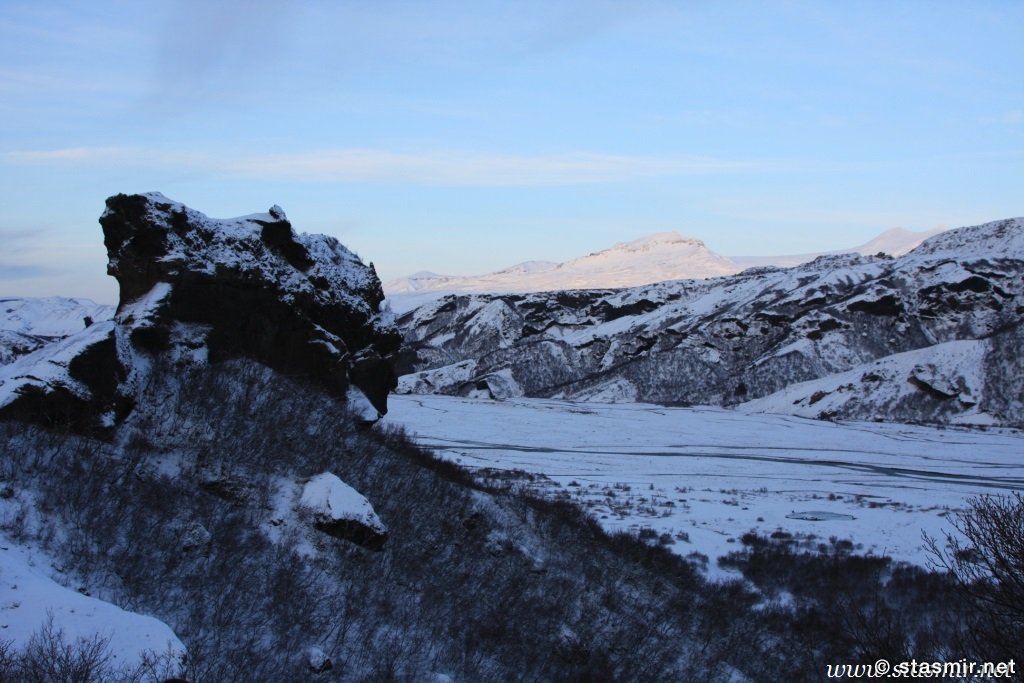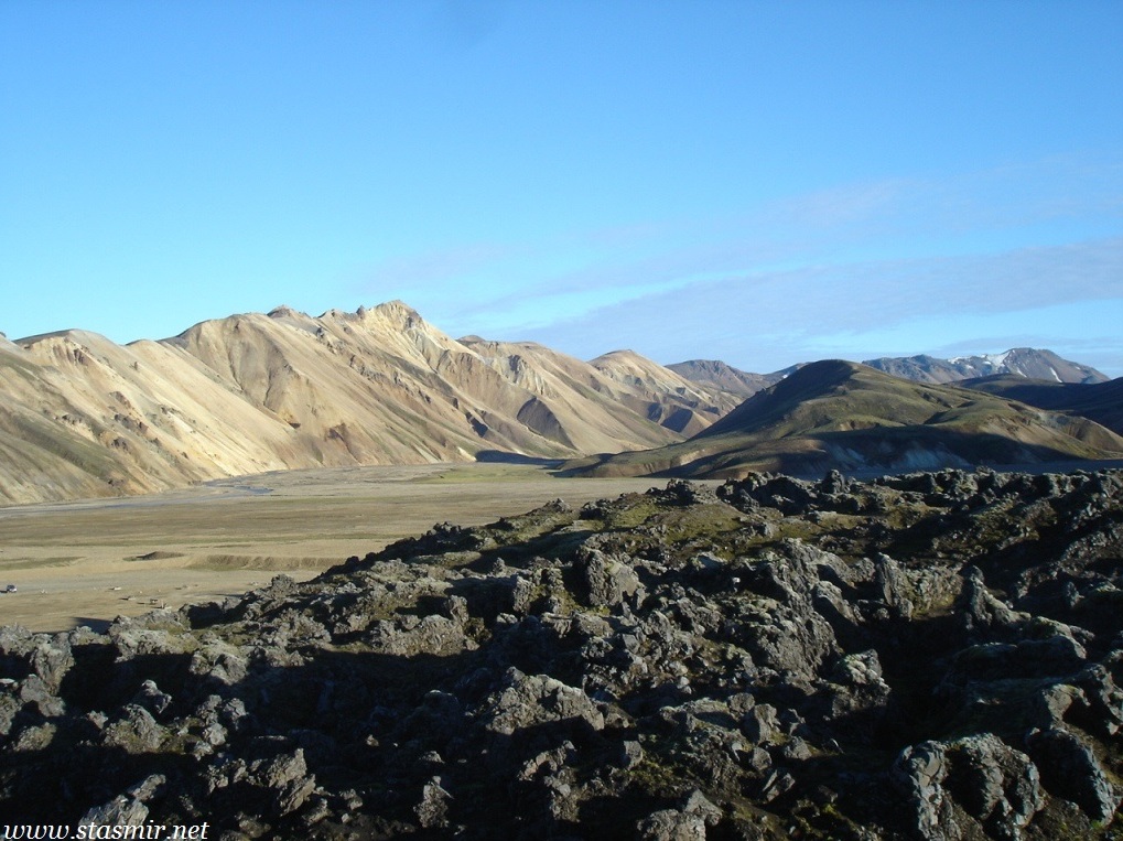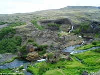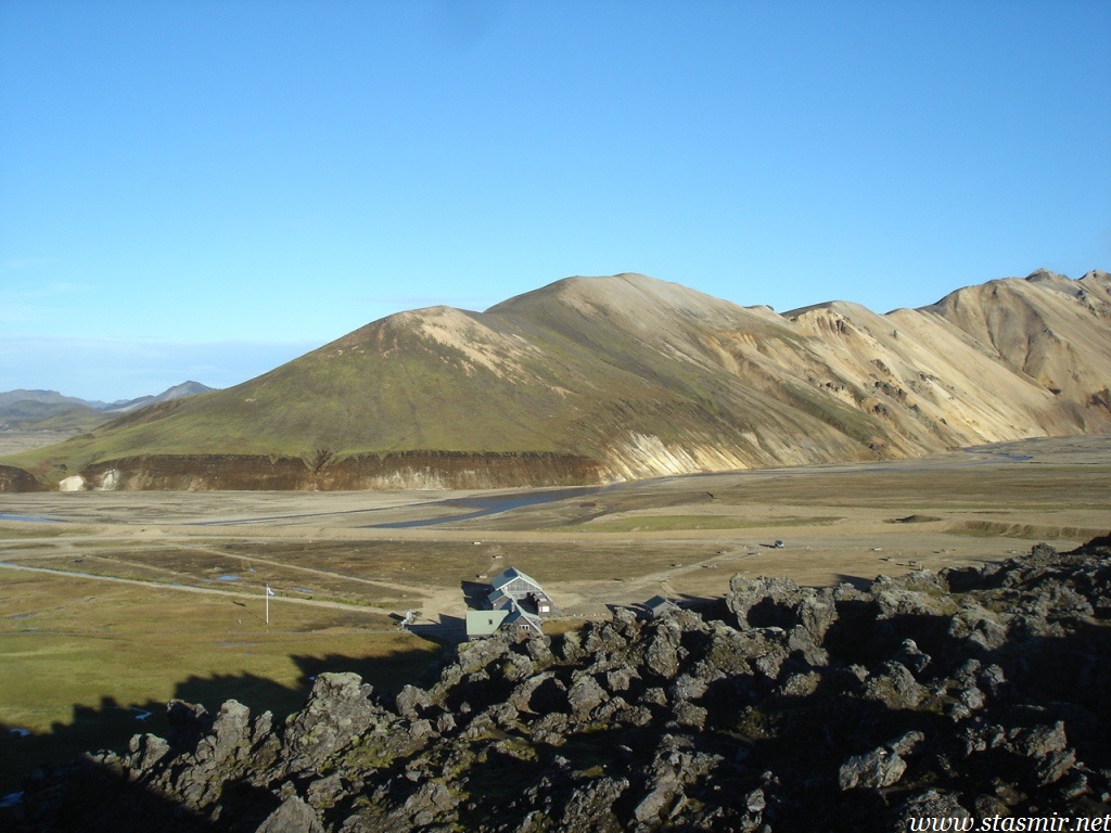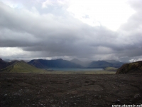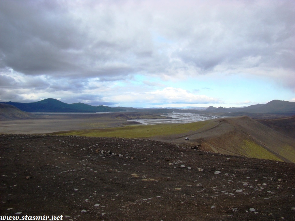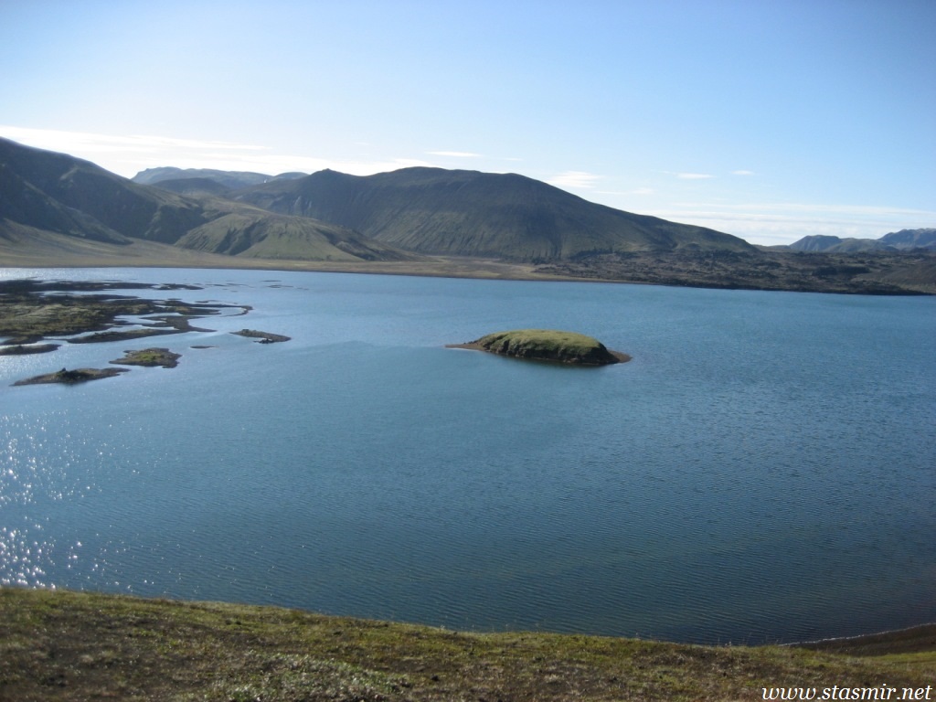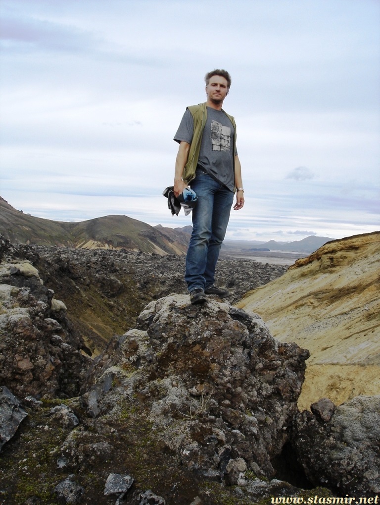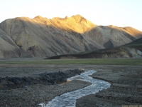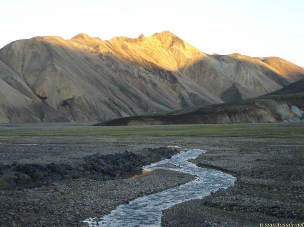 Есть и термальная речка – божественно расслабляющая, особенно в холодное время. Есть интересные места по дороге – предгорья Геклы – врата в исландский ад. Живописные водопады, которые не хочу описывать, потому считаю их своей тайной: не хотелось бы, чтобы туда приезжало столько людей, сколько ездит на Золотой водопад! Фантастические взрывные кратеры, которым исландцы дают нарочито «поэтические» имена – например, «уродская лужа». Каскады озер к северу от турбазы, где можно в полном одиночестве и за скромную плату ловит форель. «Исландские Помпеи» – ферма викинга, которую отрыли из под пепла, оставленного первым после заселения в Исландии человеком извержением Геклы. Голубые пики вдали. Тропа, названная как главная улица в Рейкьявике – Лёйгарвегур – «ручейковый путь». Она ведет от ручейков в Ландманналёйгар к перешейку между Эйафйатлаёкудлем и Мирдальсьёкудлем.