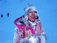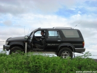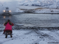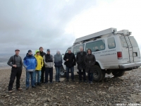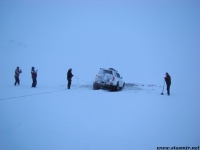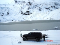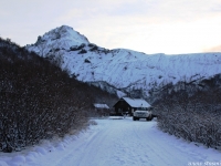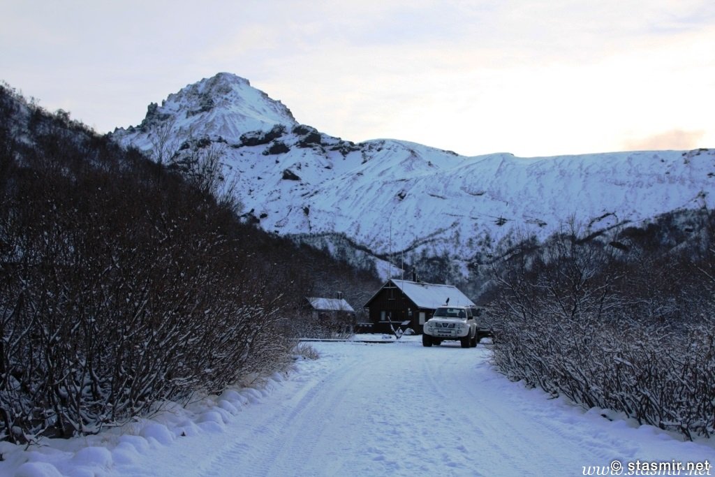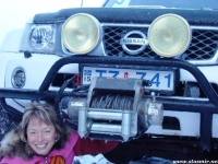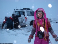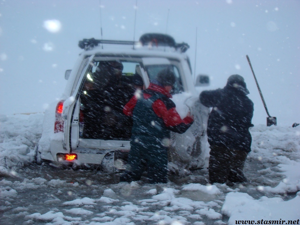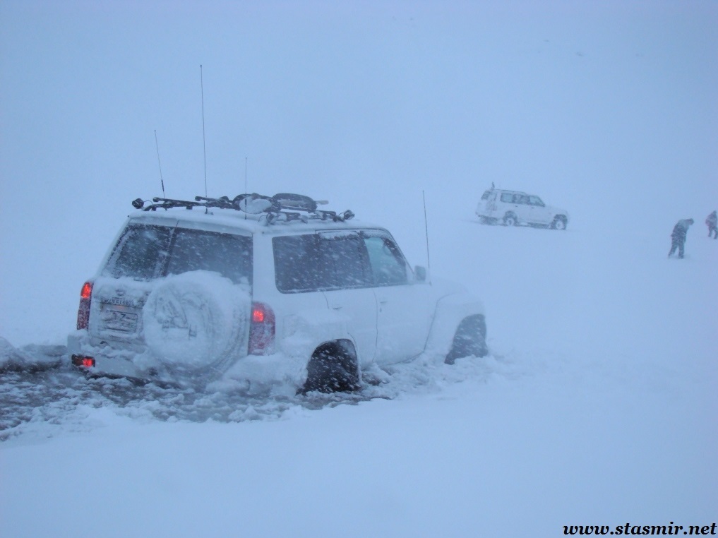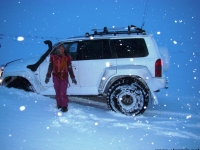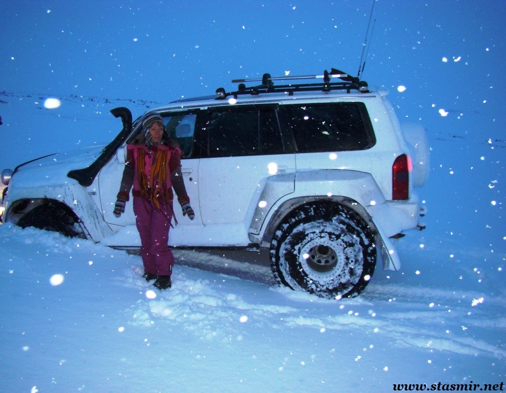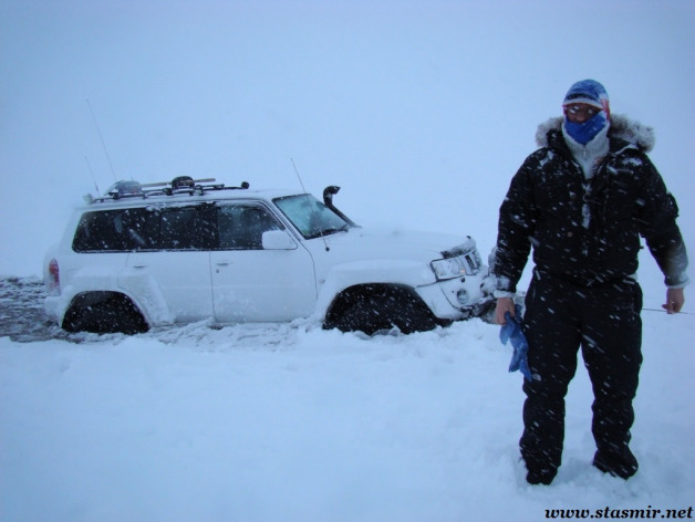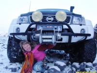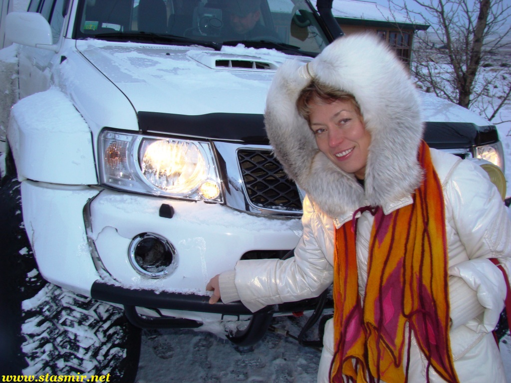 Не назовешь приятным и то открытие, которое мы сделали, стоя на «высотке», куда пытался въехать Крис. Он ехал на заднем приводе! Передний явно не включался, о чем мы начали догадываться еще в машине. Сдавшись, Крис выбрал более пологий, но более заснеженный склон, и намертво засадил машину. Одолжив у меня телефон с московским номером, который, как он утверждал, ловил сеть лучше, чем его, Крис устремился по пояс в снегу на ближайшую горку, где по его расчетам должны была работать связь. Мы с интересом наблюдали его «танец снежного человека» снизу. Опасаться нам было нечего: стоял легкий солнечный морозец, снежные просторы манили на прогулку. Благо, до туристической базы оставалось всего пара километров. Так считал Крис, вернувшийся с гор, чтобы чинить механические «стаканы» на передних колесах джипа, с помощью которых подключается передний привод. На туристическую базу, как он выяснил, уже пробилась пара джипов: нас ждали.