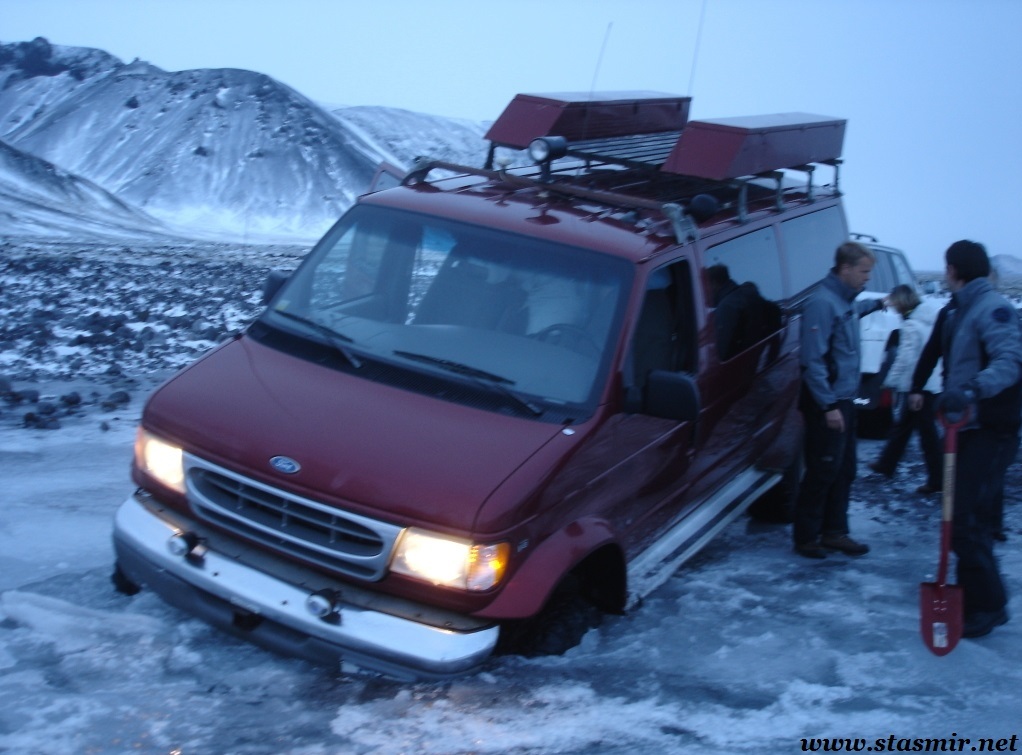 Я никогда не вмешиваюсь в действия водителя – даже неверные – потому рулит все равно он. Тем более в такой интимный процесс, как ориентирование исландского лунохода-суперджипа в лавово-снежном буреломе по дороге в Ландманналёйгар. Хочу заметить, что – в отличие от всяческих песчаных сафари в так называемых «Дубаях» – джип-сафари в Исландии не понарошку: они не представляет угрозу для жизни, но несут риск застревания. Водители имеют дело с постоянно меняющейся водной, ледовой, снежной и погодной обстановкой: где-то чуть занесло, подтаяло или стало полноводнее, и пройденный вчера брод сегодня станет ловушкой. Я называю это проклятием утопленных исландок. Как Удины ледниковых рек, они подстерегают потомков топивших их пуритан на переправах, чтобы затянуть в коварные бездны – пока вода не зальет двигатель через торчащий нелепым перископом шноркель. Временами мне представляется мудрым сдаться и вернуться назад, не достигнув конечной точки, но туристам это может показаться халтурой.