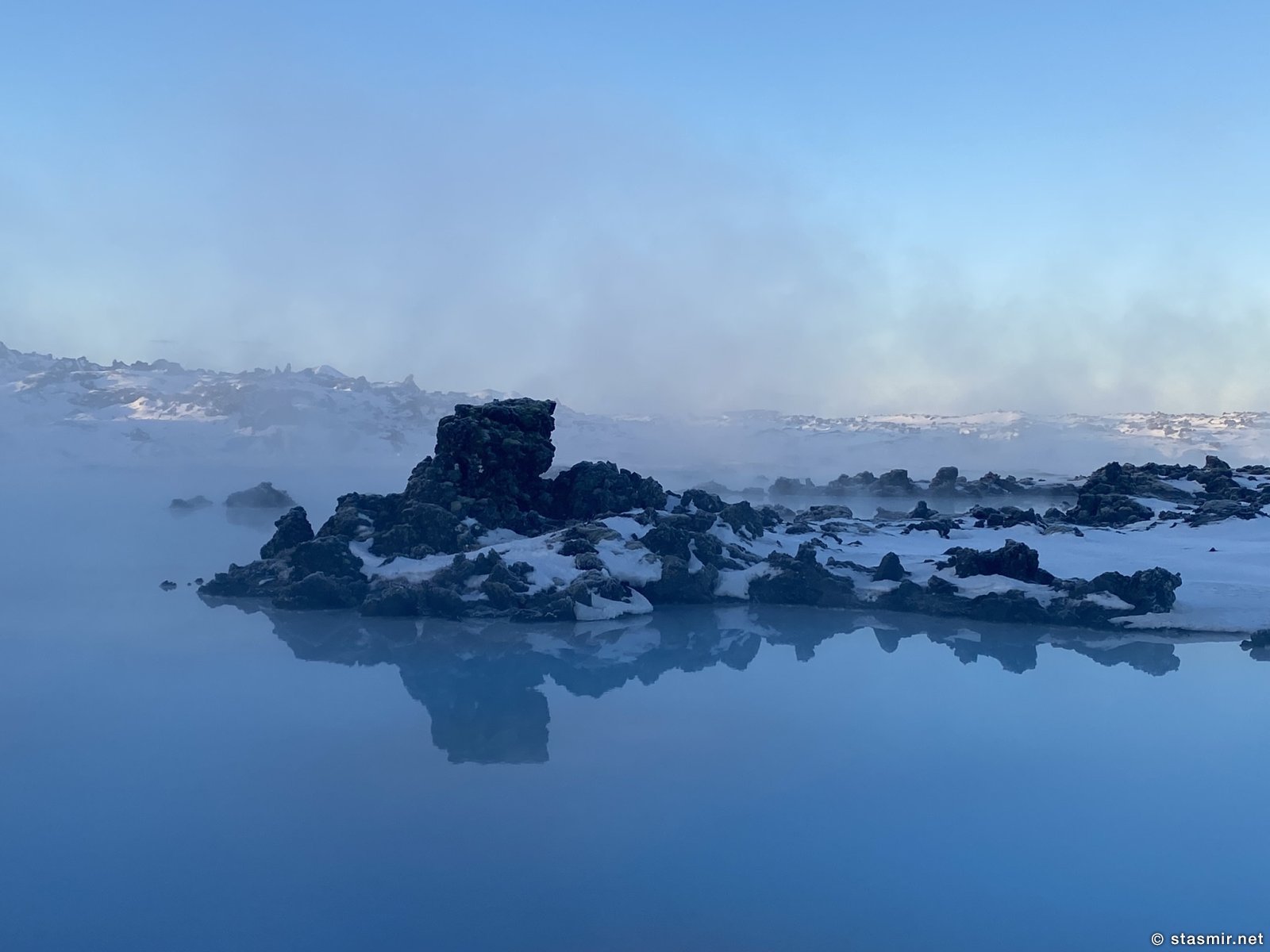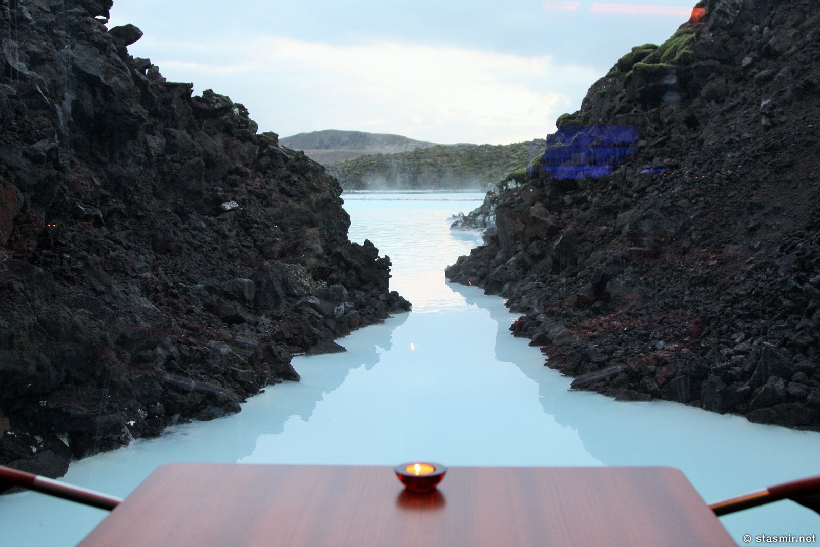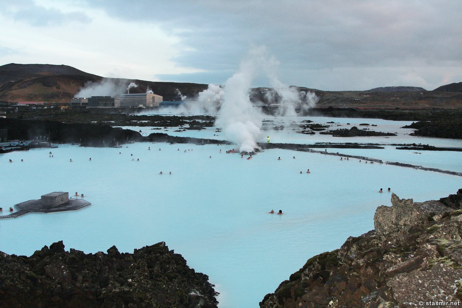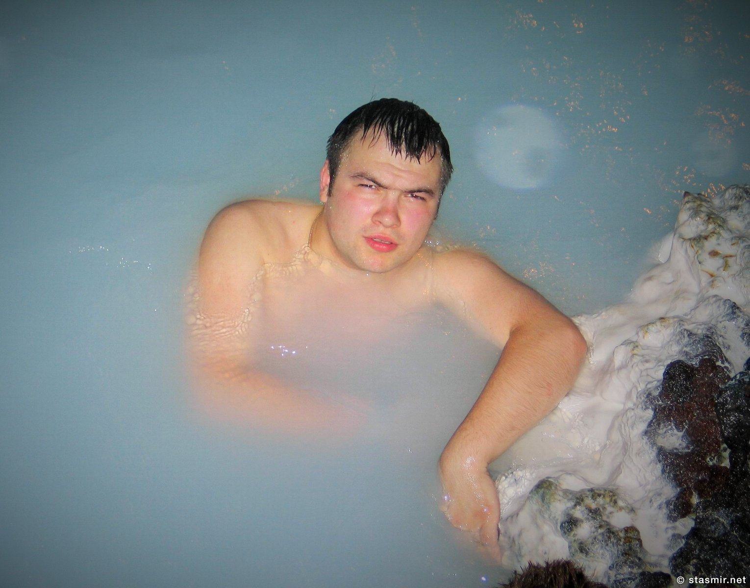 Даниэль – человек, у которого всегда есть План. Он отвез нас в Голубую Лагуну – на «Похмельную Вечеринку». Мысль что надо. Голубая Лагуна, которая находится недалеко от аэропорта Кефлавик, на самом деле является побочным продуктом геотермальной электростанции неподалёку, которая обеспечивает энергией, водой и теплом тысячи исландцев, добывая сверхгорячий кипяток из земных недр. Но пусть вас не беспокоит промышленное происхождение воды: она совершенно безопасна. Напротив, все в один голос твердят, что вода в Лагуне лечит кожные заболевания – экзему и псориаз – хотя местами лично мне она кажется слишком горячей: настолько, что я начинаю думать о лангустинах, которых кидают в кастрюлю с кипящей водой в моем любимом ресторане «Fjöruborðið» [Берег моря] в Стокксейри. Знатоки утверждают, что перед тем, как встретить свой ошпаренный конец, эти небольшие и вежливые лобстеры пронзительно визжат. И я не могу не понять их состояния. В Лагуне содержатся неподвластные моему воображению шесть миллионов литров воды, которые обновляются каждые сорок восемь часов. Вода супер-теплая, а своим роскошным цветом, дающим название Лагуне, она обязана минералам, кремнию и водорослям. Именно они и образуют «супец», в которым плещутся туристы.