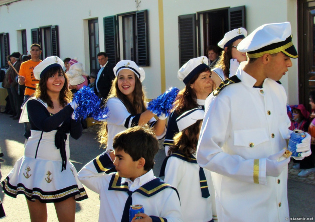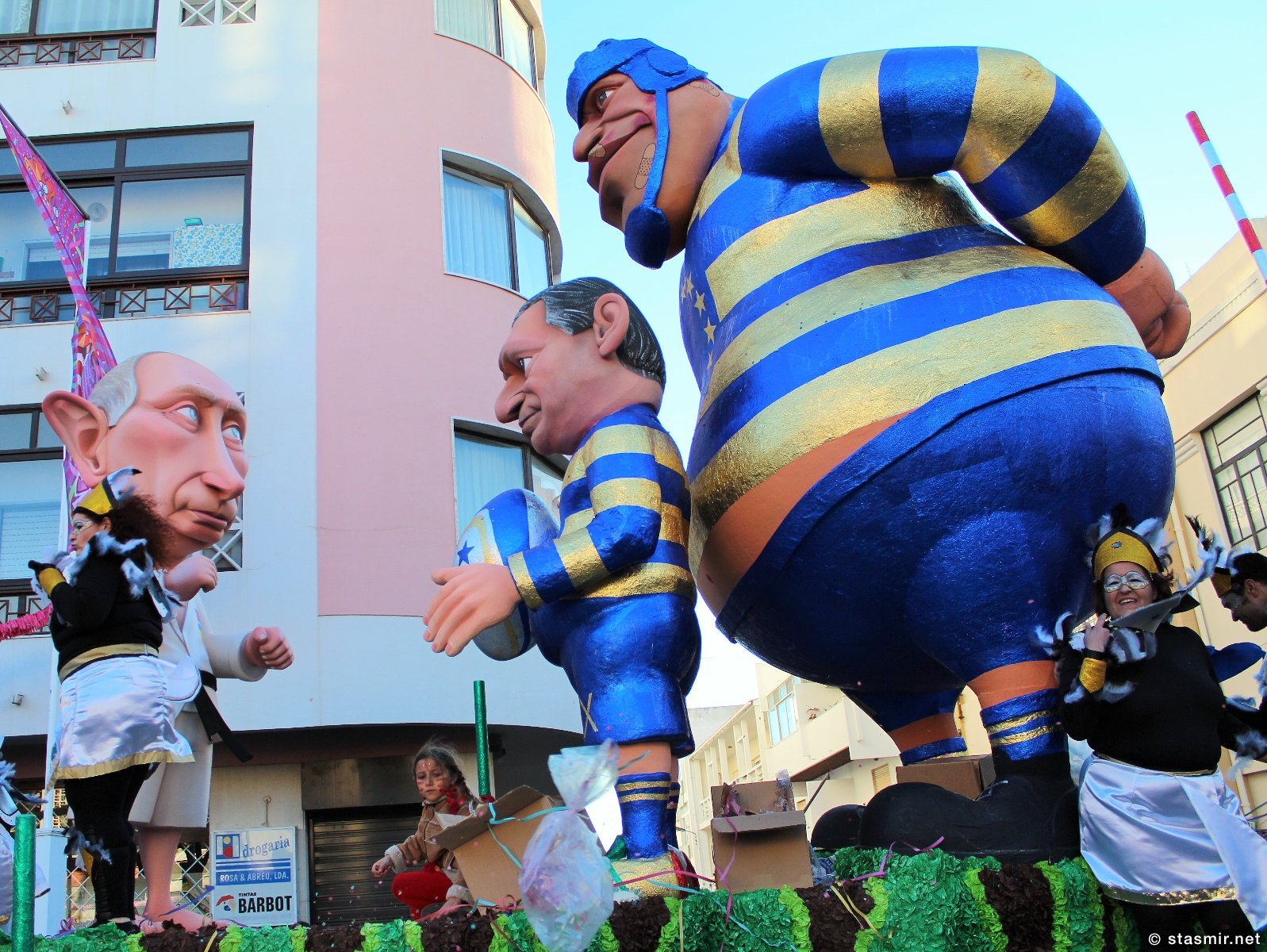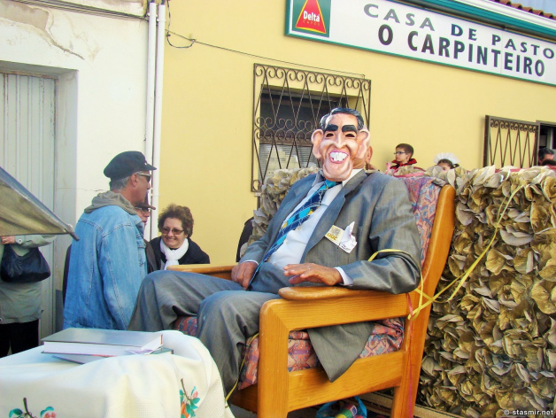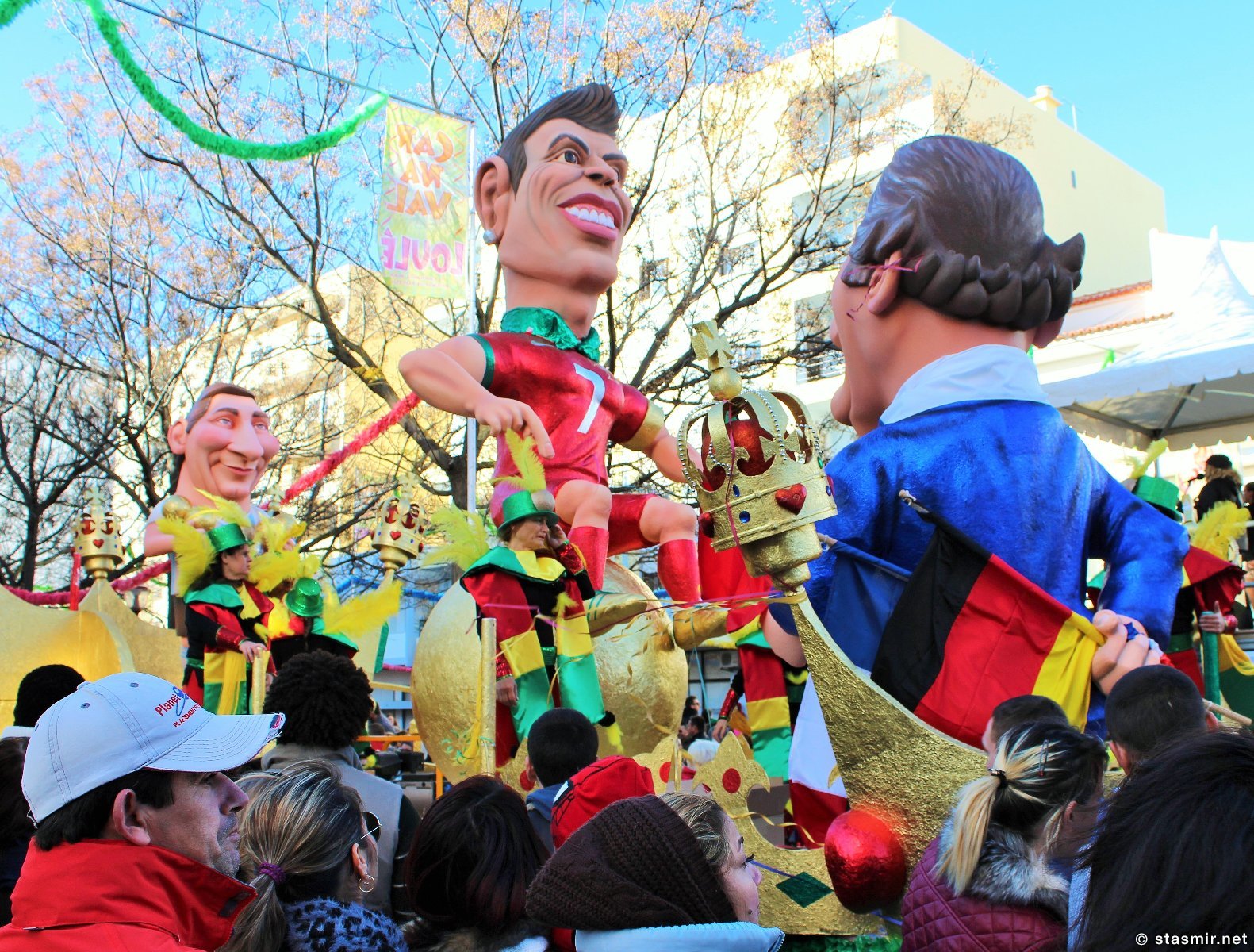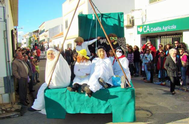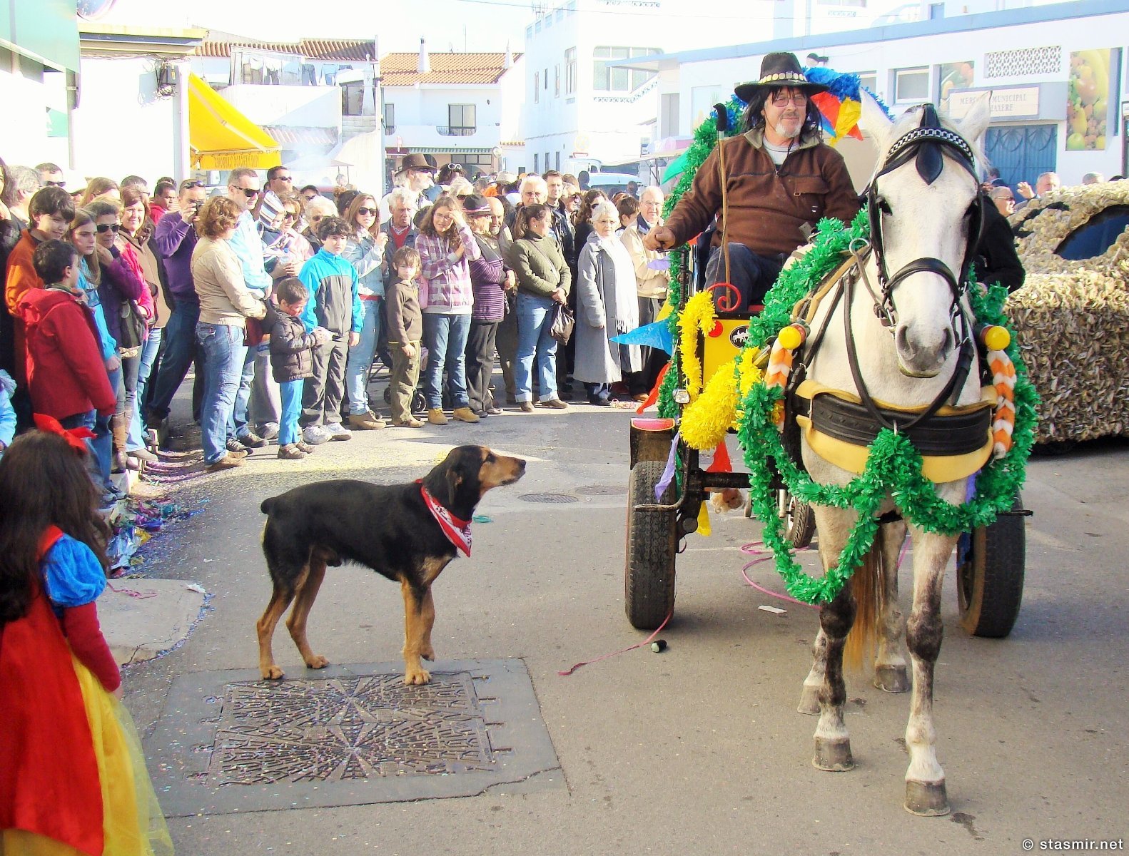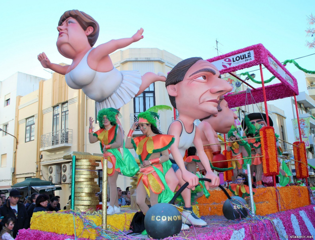 Наблюдал и самый большой карнавал в провинции Алгарве – в городе Луле. В этом шествии была представлена политическая сатира, хотя не в таком объеме, как во время студенческого праздника сжигания ленточек. Стандартные герои карнавала: бывший премьер Сократеш, в настоящее время проживающий в камере предварительного заключения, «Тройка» кредиторов (Еврокомиссия, Евро ЦБ и МВФ), которых португальские СМИ представляют чуть ли не мировым злом, другие популярные политики и футболисты. А также неминуемые в любой португальской процессии буржуи и ковбои: они сидели в кибитке, запряженной пони или осликом, и курили сигары.