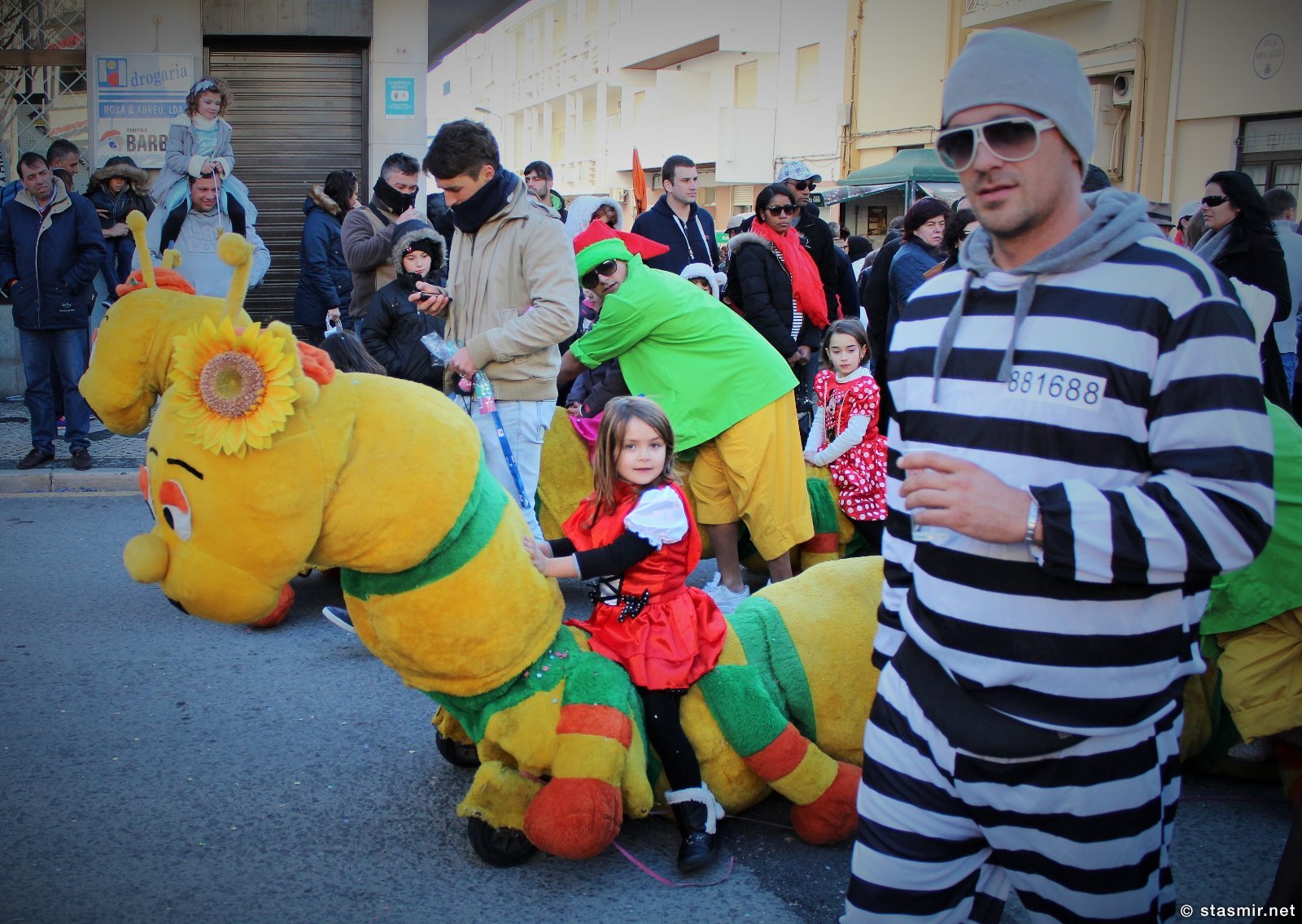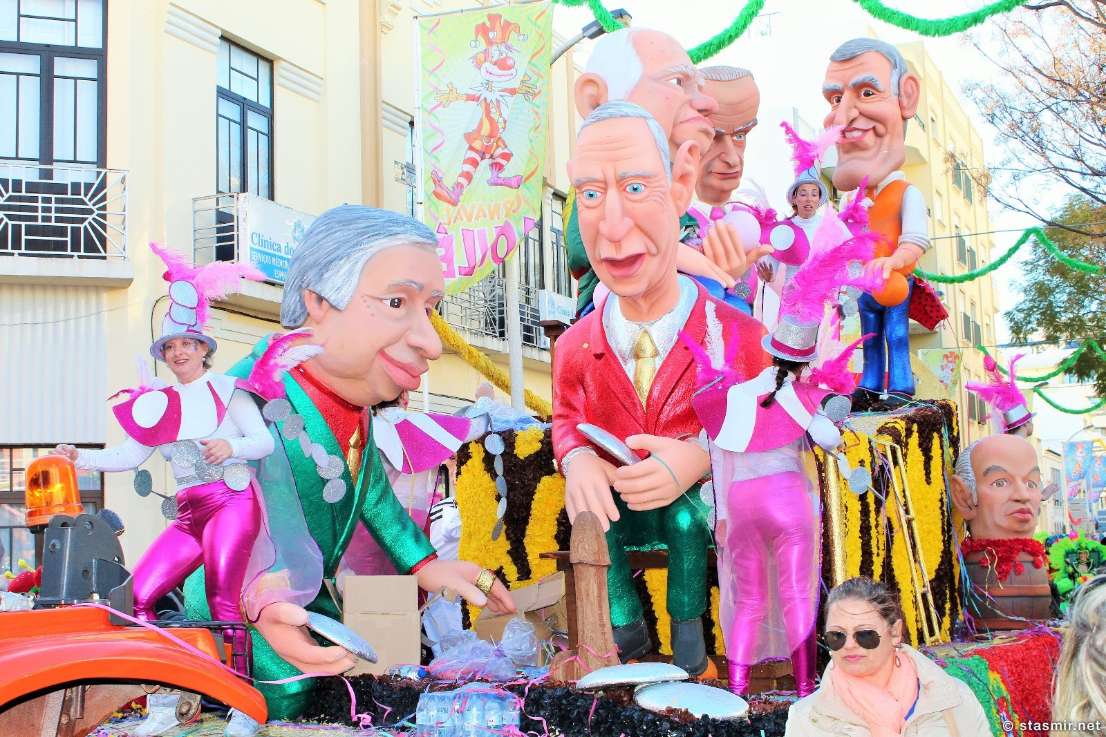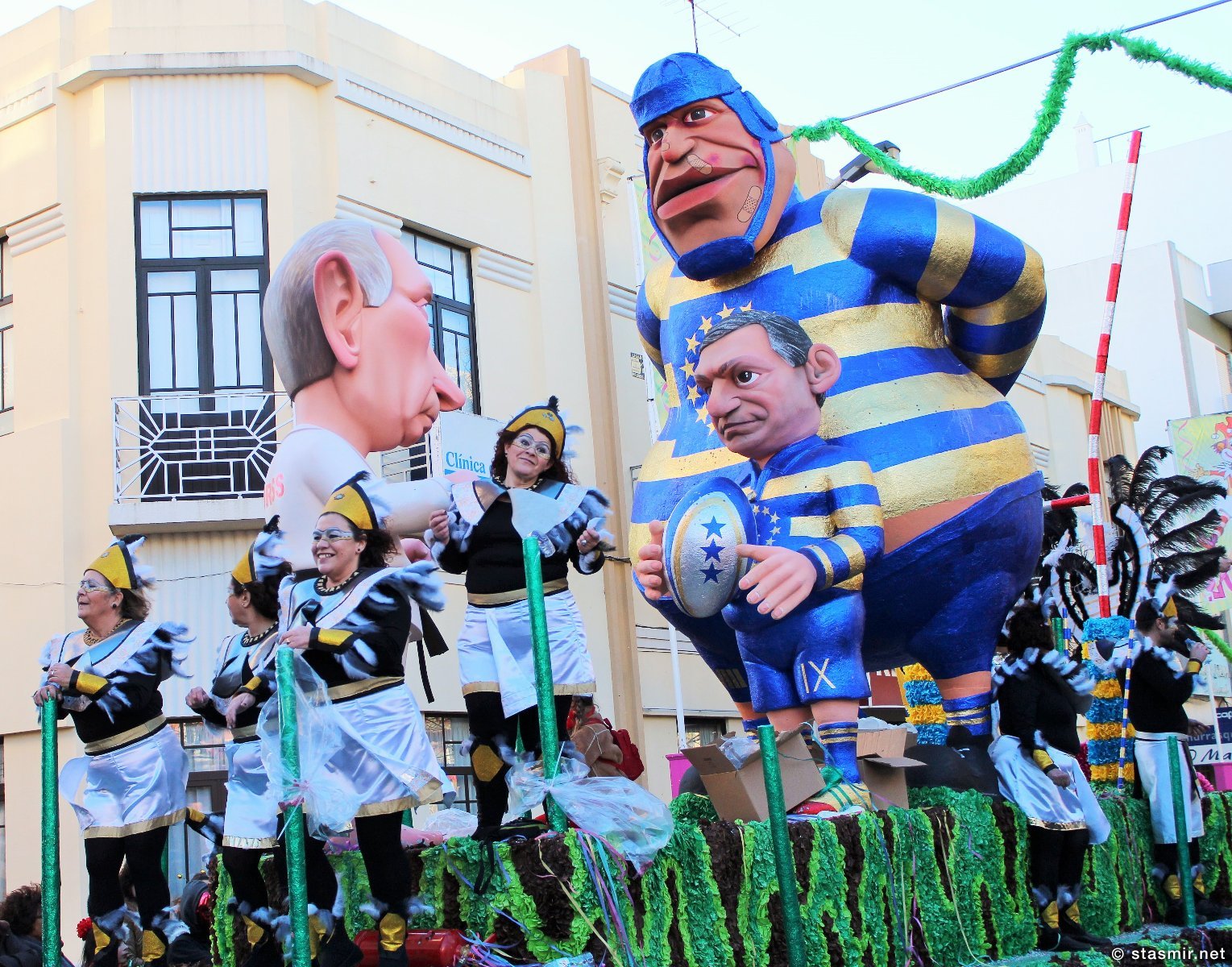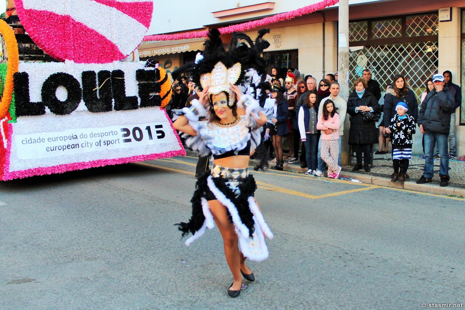 Наблюдал и самый большой карнавал в провинции Алгарве – в городе Луле. В этом шествии была представлена политическая сатира, хотя не в таком объеме, как во время студенческого праздника сжигания ленточек. Стандартные герои карнавала: бывший премьер Сократеш, в настоящее время проживающий в камере предварительного заключения, «Тройка» кредиторов (Еврокомиссия, Евро ЦБ и МВФ), которых португальские СМИ представляют чуть ли не мировым злом, другие популярные политики и футболисты. А также неминуемые в любой португальской процессии буржуи и ковбои: они сидели в кибитке, запряженной пони или осликом, и курили сигары.