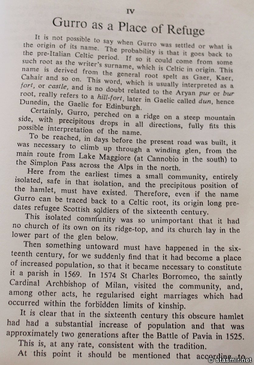 Вот что я хотел рассказать: меня попросили сделать тур по Шотландии, который по визовым причинам не состоялся. Вместо Шотландии поехали в Италию, которая для меня всегда северная. Сколько пляжами ни корми – все в Альпы тянет. Остановились в любимом Каннобио на Лаго-Маджоре в Пьемонте. В этом апреле и Лаго, и Каннобио залило так, что речка и озеро разбухли, как цветки повсеместной здесь камелии. Захотелось в горы, и я запетлял машину в направлении Домодоссалы у подножья Итальянских Альп. По пути наткнулся на Гурро – город на высоте 900 с чем-то метров со вполне исландским населением в дести душ. Шотландских, как выяснилось.