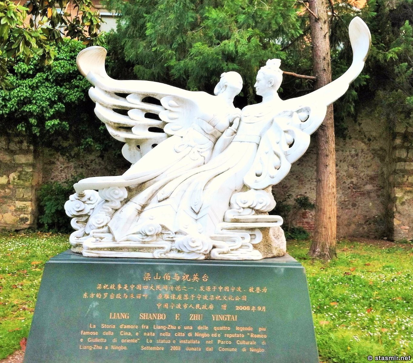 С китайской темой встретился еще раз в Вероне, где отправился навестить могилку Джульетты, а попал на закрытое «на переучет» кладбище. Кладбище не работало, но перед входом стоял китайский памятник китайским влюбленным. Памятник красивый – спору нет, но как-то это все немного… навязчиво, и не к месту. Или я не прав? Надо бы спросить у коренных веронцев.