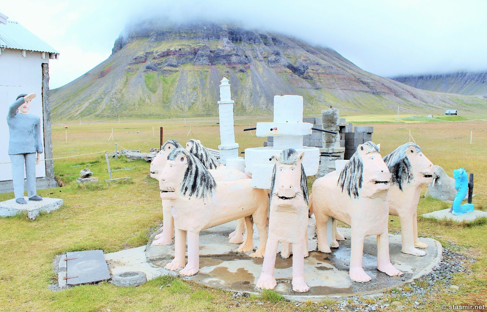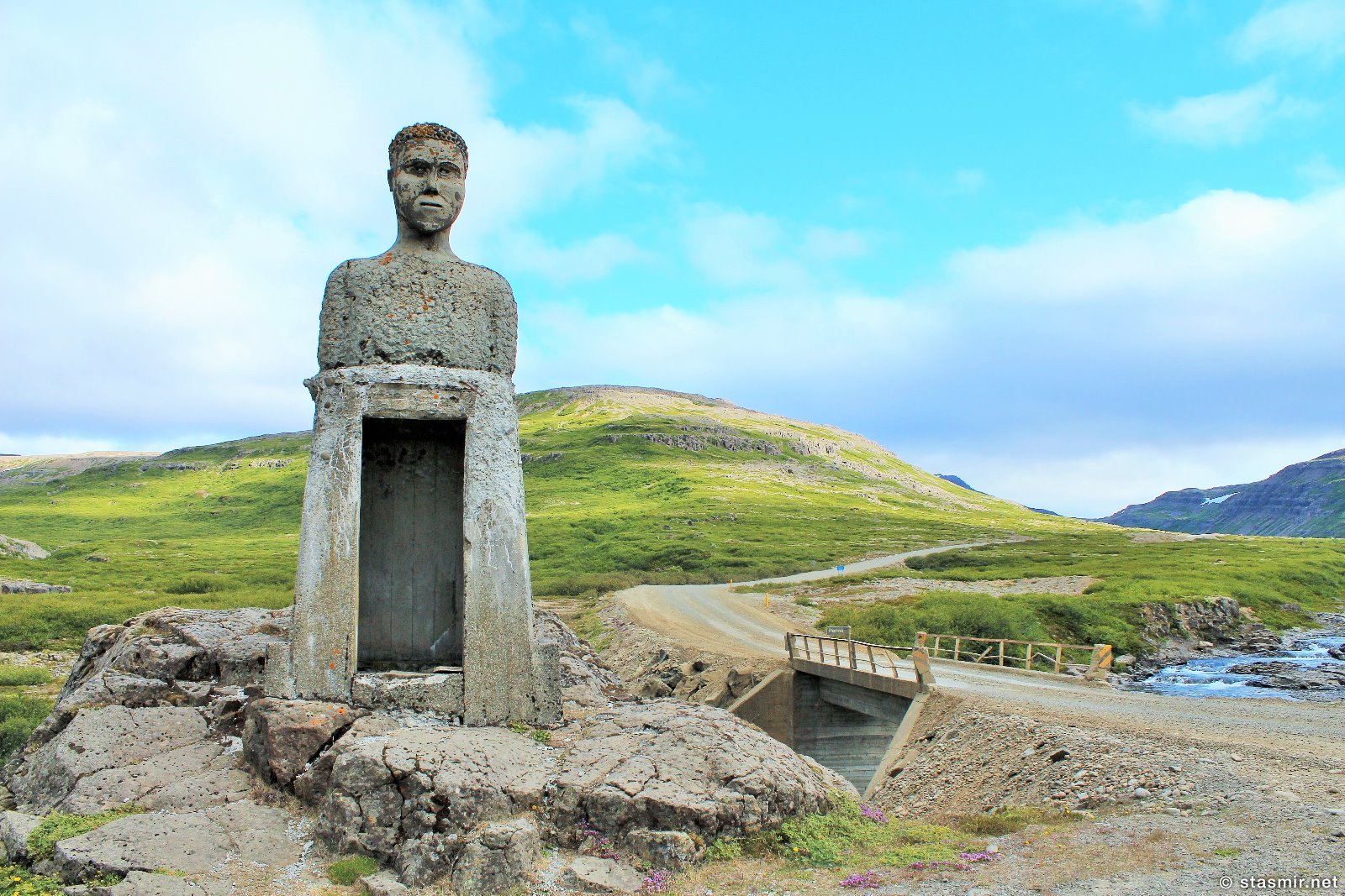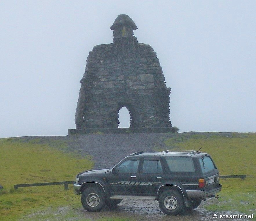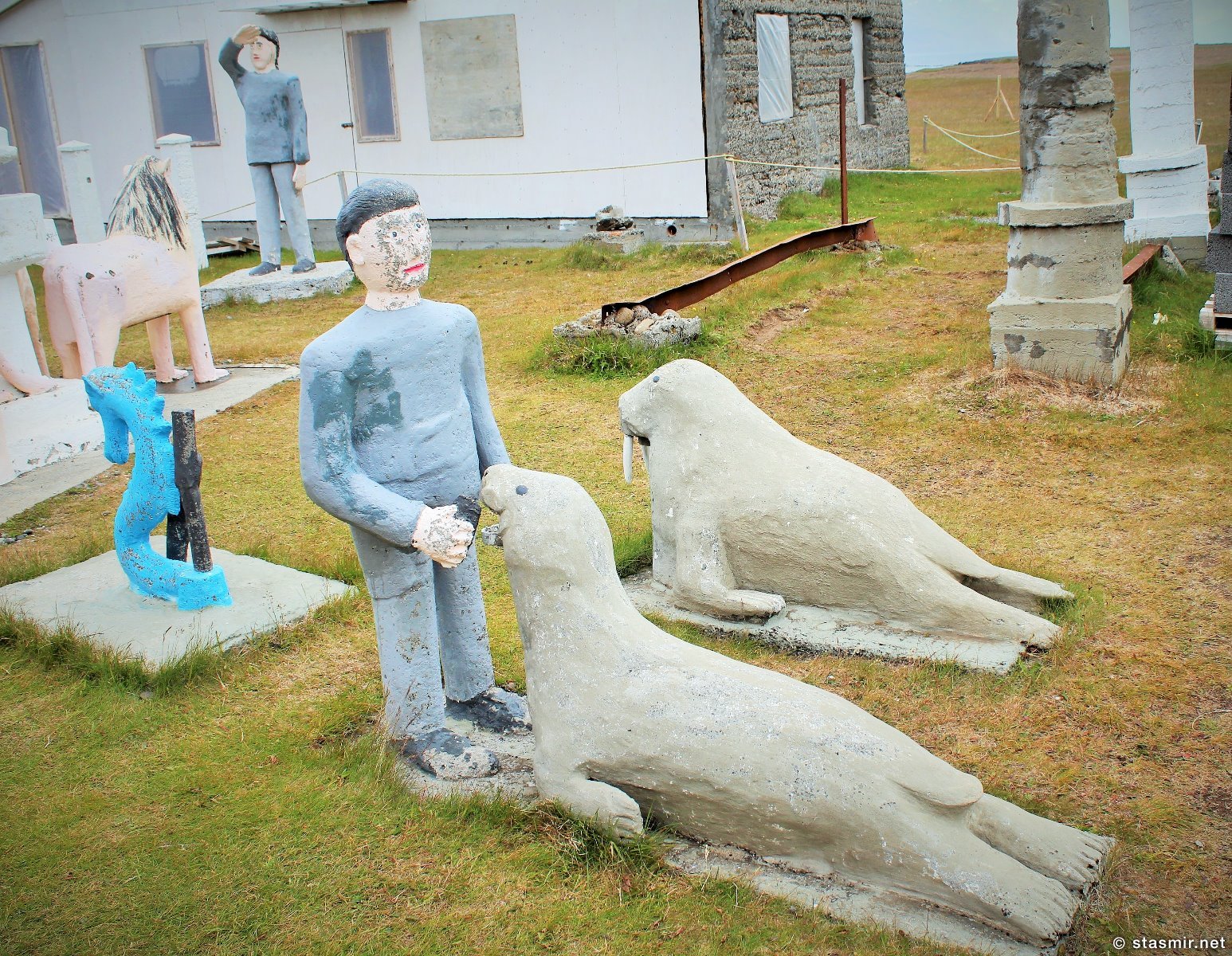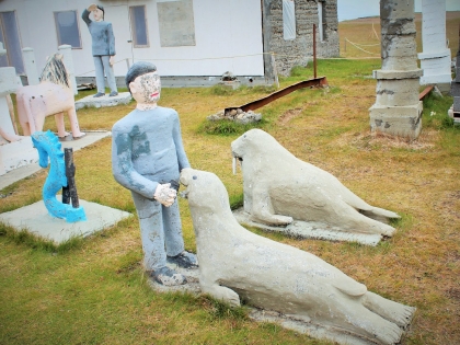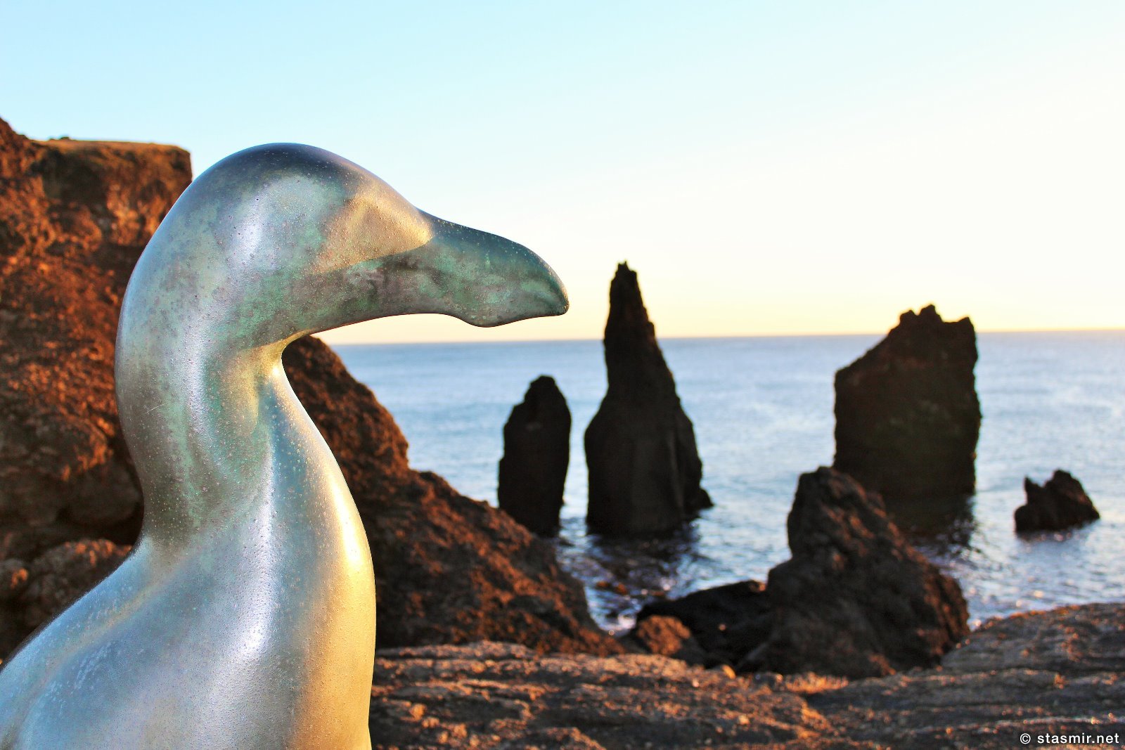 Оттоптавшись на людях, птицы начинают скучать по человечеству. Они как бы перенимают эстафету цивилизации у Homo Sapiens. Вместе с цивилизацией приходит ретроспективность, тоска по прошлому. Гагарки начинают строить памятники уничтоженным им людям. Какими будут эти памятники, изготовленные с применением птичьих мозгов? Мне почему-то кажется, что ответ на этот вопрос дают многочисленные примеры любительской скульптуры, разбросанные там и здесь по сегодняшней Исландии. Согласитесь, человек в них видится немного с птичьей перспективы…