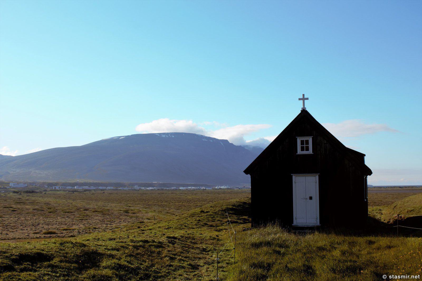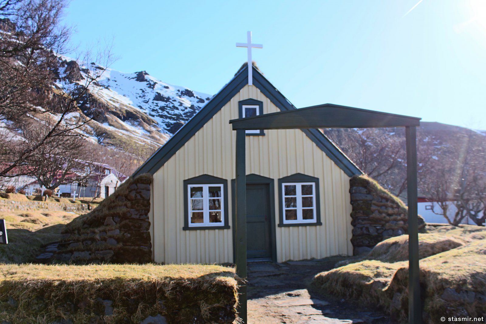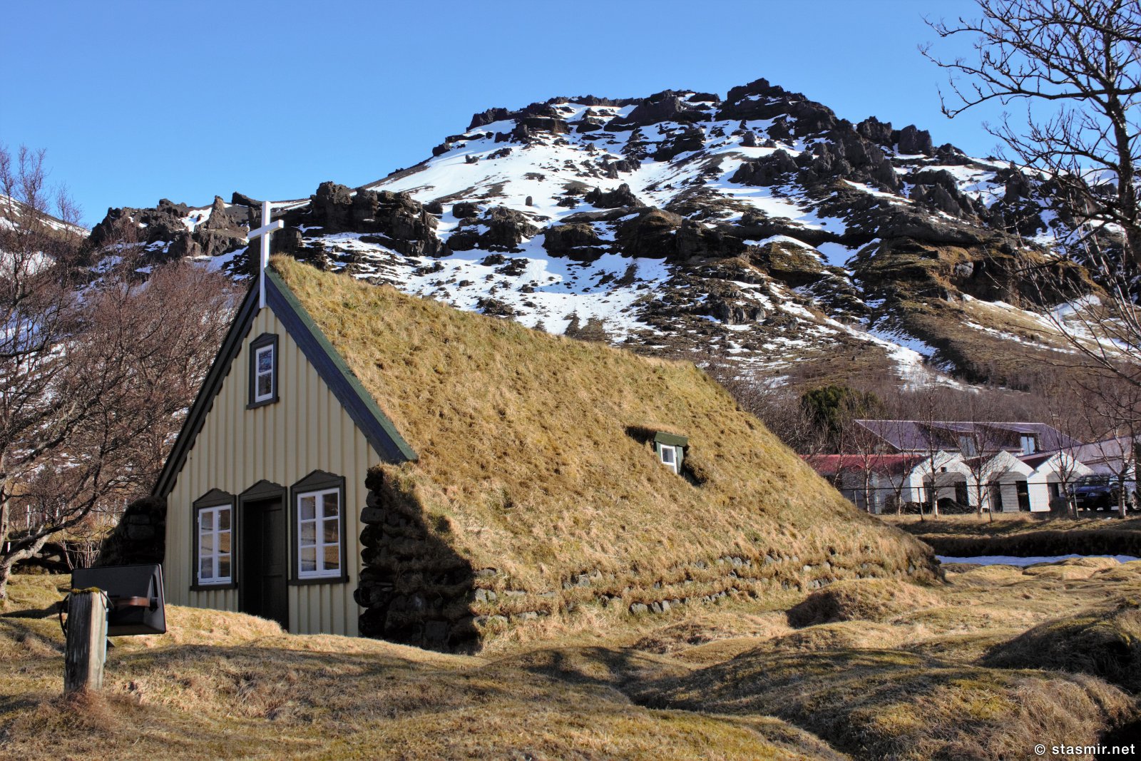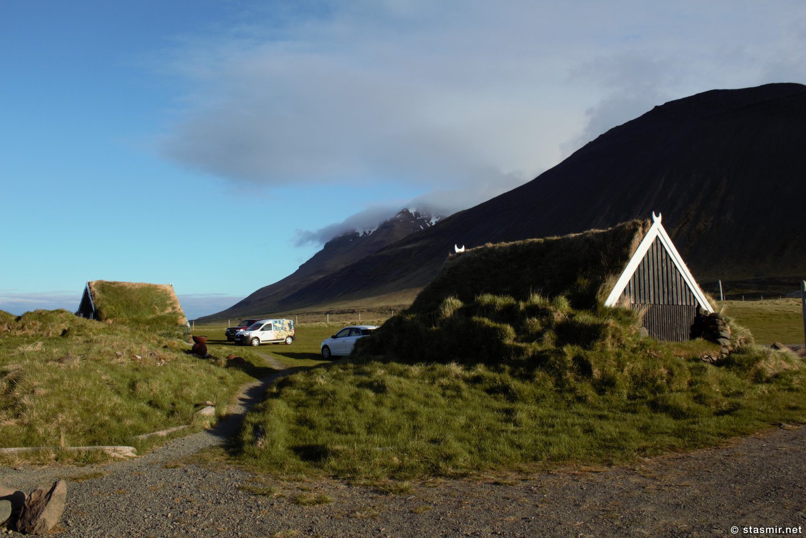 А вот как было дело в 1974 году. В Сандфедле (так называется место бывшей торфяной фермы) – старое кладбище и памятная рябина. На нем круглосуточно восседают два ворона: как Хугин и Мунин. В 1974 году на район по поводу тысячастолетия заселения Исландии и завершения кольцевой дороги прибыл Президент Исландии Кристьяун Эльдьяудн. Местные прогрессивные фермеры подготовились к его приезду и традиционные землянки – в уникальном стиле Скафтафедля – «случайно» сожгли. Затем сравняли с землей бульдозером.