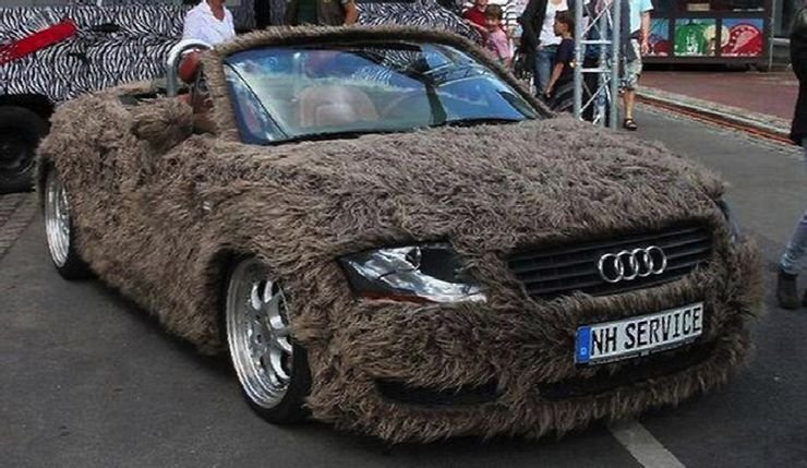 Машинка в мохнатых шкурках. Фото взято с сайта https://www.hotcars.com/19-people-who-modded-their-cars-with-fur/. Автор Via Hooniverse.com