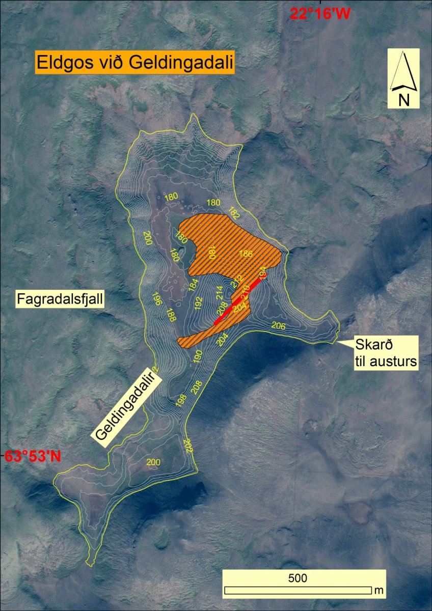 Исходя из сегодняшних темпов “лаваизвержения” в долине Гелдингадалюр (Geldingadalur) на полуострове Рейкьянес в Исландии, лава заполнит долину за 10-20 дней. Затем, она, вероятно, потечет вниз по склону – скорее всего в южном направлении. Так оценивает перспективы извержения Магнус Туми Гудмундссон (Magnús Tumi Guðmundsson), профессор геофизики, на основании схемы, обнародованной Йоуханном Хелгасоном в социальным сетях.
