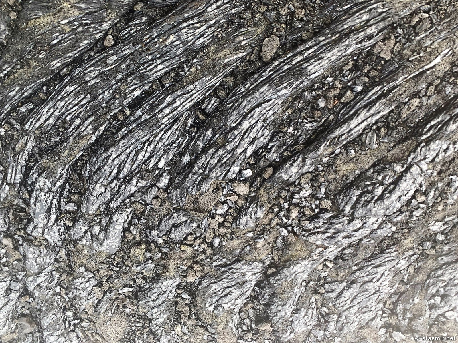 — Поверхность свежезастывшей лавы крайне нестабильна и хрупка, что ясно видно на фотографии. Имеется риск проломить застывшую корочку, в результате чего жар снизу ринется на поверхность, либо порезать лодыжки или икры об острые края лавы.