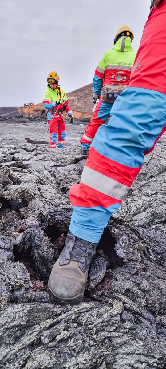 С начала извержения отряд неоднократно обращался к гражданам с просьбой не выходить на поверхность свежезастывшей лавы, поскольку она нестабильна и опасна. Сегодня, когда прошло примерно три месяца с момента выброса последней лавы, мы сочли своевременным выяснить, безопасно ли будет пройти по лавовому полю и спасти этого человека. Отряд выдвинулся через лаву к безопасному месту, где старая твердь покоится под максимально тонким слоем лавы. Мы вышли к цели, вооруженные мощными тепловизорами и щупами.