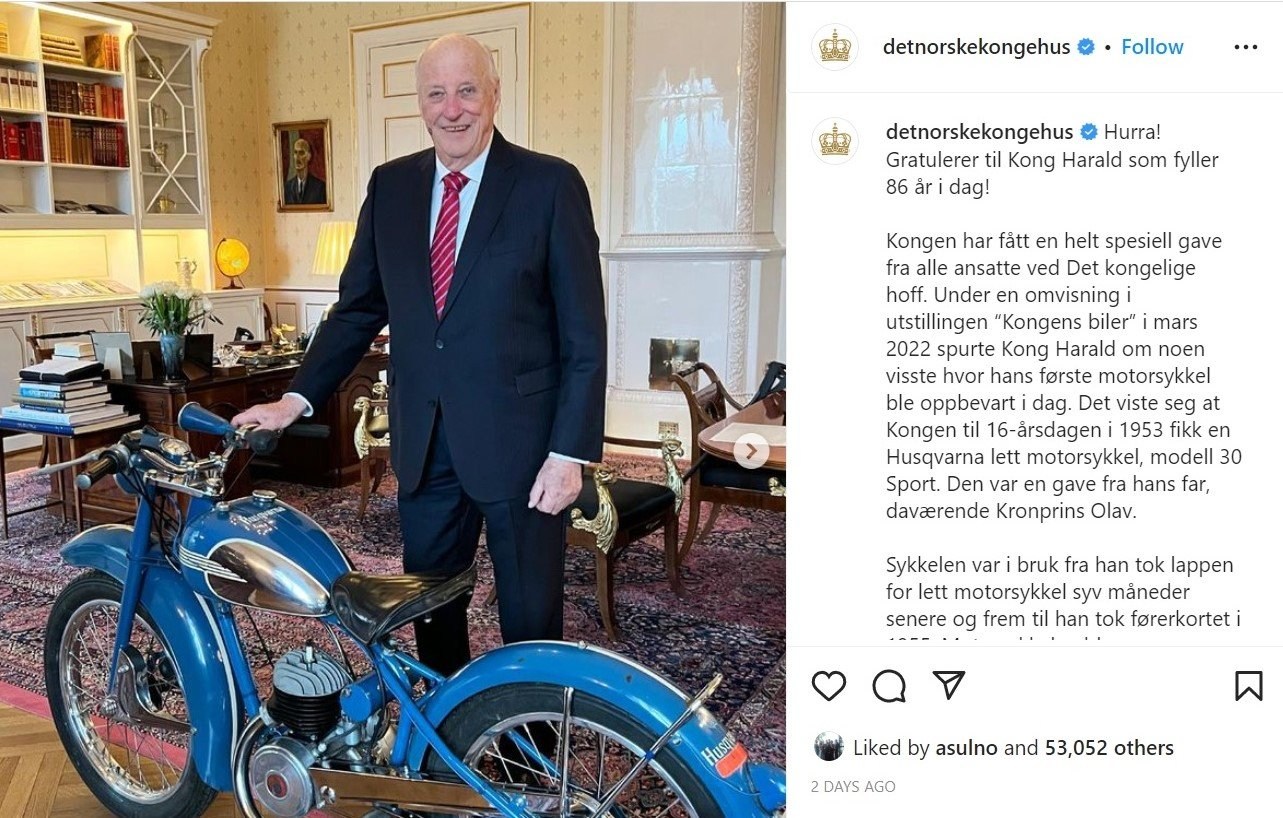 Пожеланка пожеланкой, но что дарить таким UBлярам? Чего может хотеться 86-летнему королю Норвегии? Хускварну! Не газонокосилку, не бензопилу, а мотик. Дело в том, что на свой 16 день рождения в 1953 году король Харальд V получил легкий мотоцикл марки Husqvarna, модель 30 Sport от своего отца кронпринца Улафа (впоследствии короля Улафа V). Через 7 месяцев после дня рождения будущий король получил права на мотоцикл, после чего рассекал на своей Хускварне вплоть до 1955 года, когда сдал на права на автомобиль. Мотоцикл был продан.