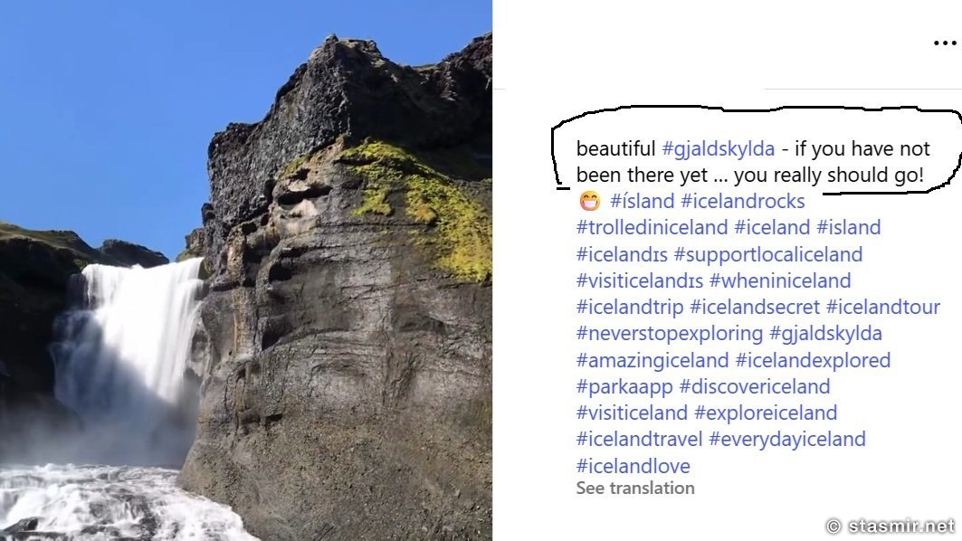 И вот еще что заметили. Первой – моя любимая исландская писательница Альда Сигмундсдоттир. Туристы комично постят фотографии чуть ли не ВСЕХ локаций на острове, как они изволят выражаться, под хэштэгом «gjaldskylda». Не верите? Введите хэштэг, скажем, на инстаграме! «Панорамный вид Гйалдскилды». «Гйалдскилда в упоительных лучах заката». Или: «северное сияние над пленительной Гйалдскильдой».