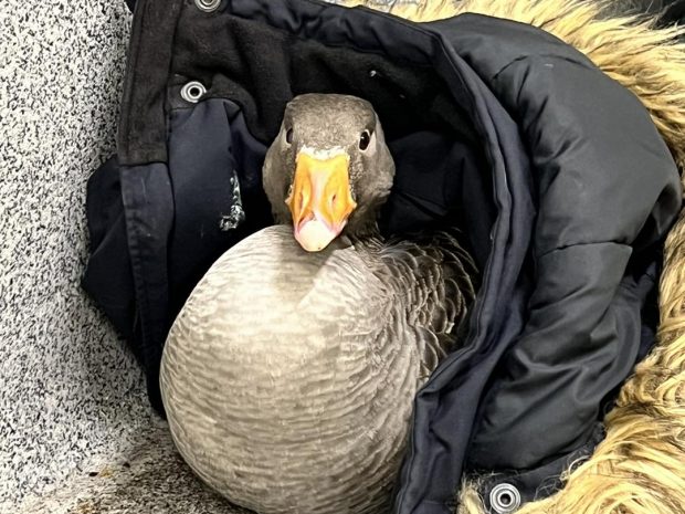 Неизвестный друг животных поведал полицейским, что ему попалась гусыня со смерзшимся клювом, которую срочно надо было спасать! Он укутал птицу в свою куртку.